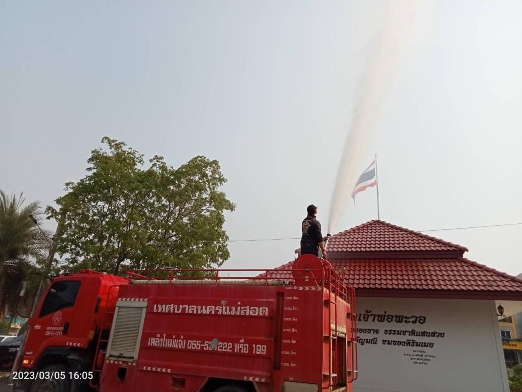 และจะดำเนินการฉีดล้างถนนและพ่นละอองน้ำ ตามถนนสายต่างๆ ตั้งแต่เวลา 20.00 น. ของทุกวัน จนกว่าสถานการณ์จะบรรเทาลง จึงขออภัยในความไม่สะดวก สามารถติดต่อสอบถามได้ที่ฝ่ายป้องกันและบรรเทาสาธารณภัย เทศบาลนครแม่สอด โทร 0-5553-1222 สายด่วน 199, 1132 วิทยุสื่อสารคลื่นความถี่ 162.550 MHz. นามเรียกขาน “ศูนย์เมืองฉอด”
