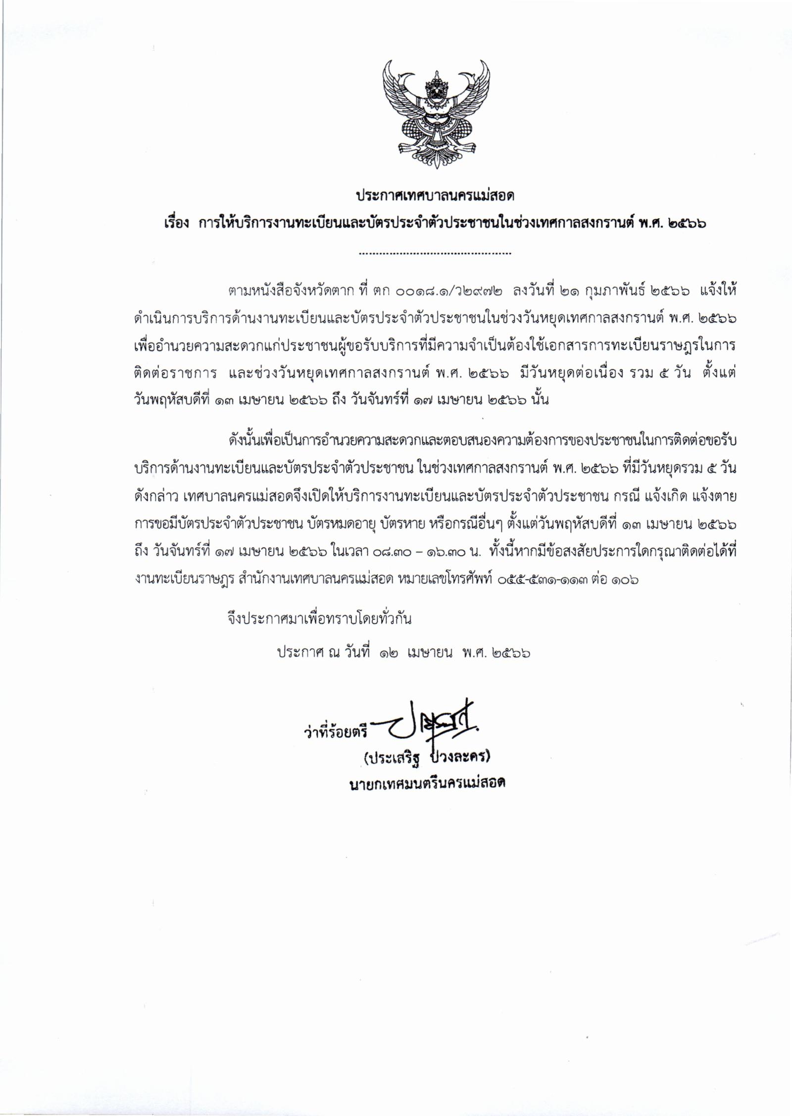 การให้บริการงานทะเบียนและบัตรประจำตัวประชาชนในช่วงเทศกาลสงกรานต์ พ.ศ.2566