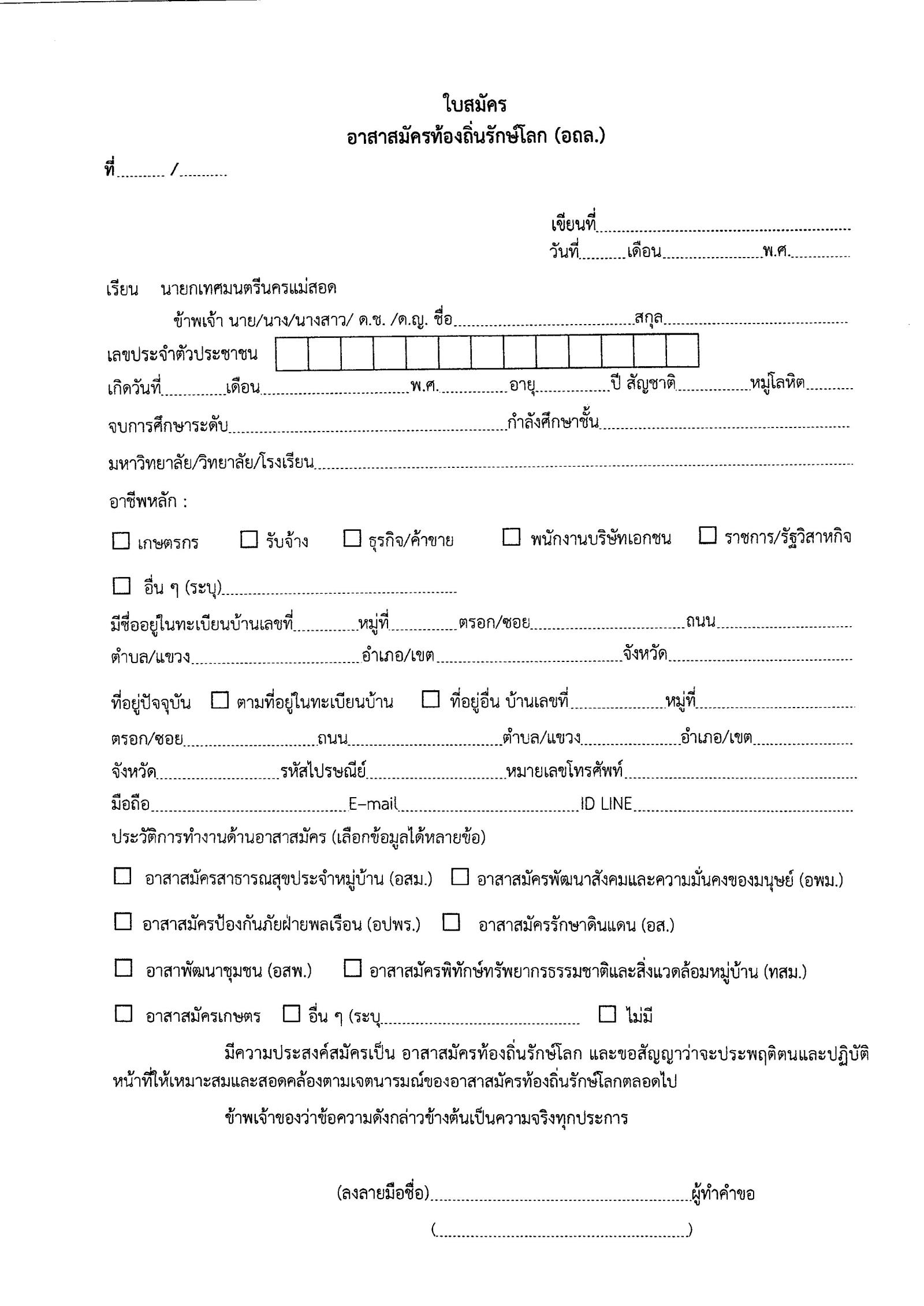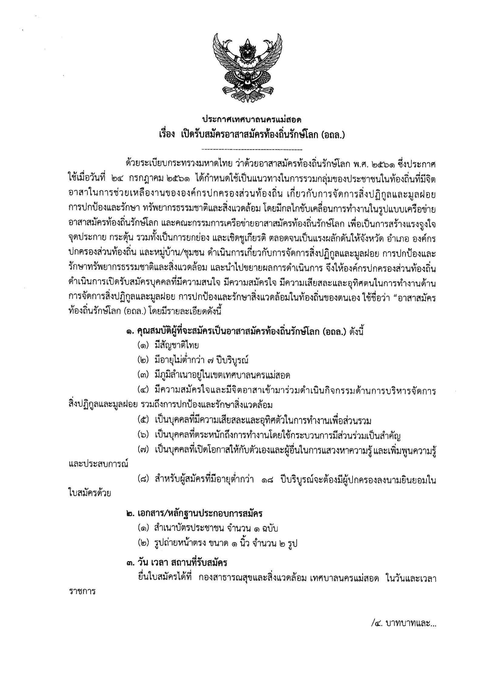 ประกาศเทศบาลนครแม่สอด เรื่อง เปิดรับสมัครอาสาสมัครท้องถิ่นรักษ์โลก (อถล.)