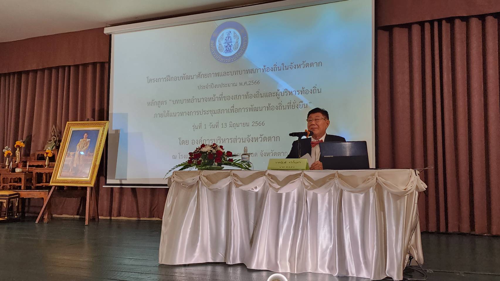 เข้าร่วมโครงการอบรมพัฒนาศักยภาพและบทบาทสภาท้องถิ่นในจังหวัดตาก ประจำปีงบประมาณ 2566 หลักสูตร “บทบาทอำนาจหน้าที่ของสภาท้องถิ่นและผู้บริหารท้องถิ่นภายใต้แนวทางการประชุมสภาเพื่อการพัฒนาท้องถิ่นที่ยั่งยืน” รุ่นที่ 1 จัดโดยองค์การบริหารส่วนจังหวัดตาก โดยมีนายณัฐวุฒิ ทวีเกื้อกูลกิจ นายกองค์การบริหารส่วนจังหวัดตาก เป็นประธานเปิดโครงการฯ