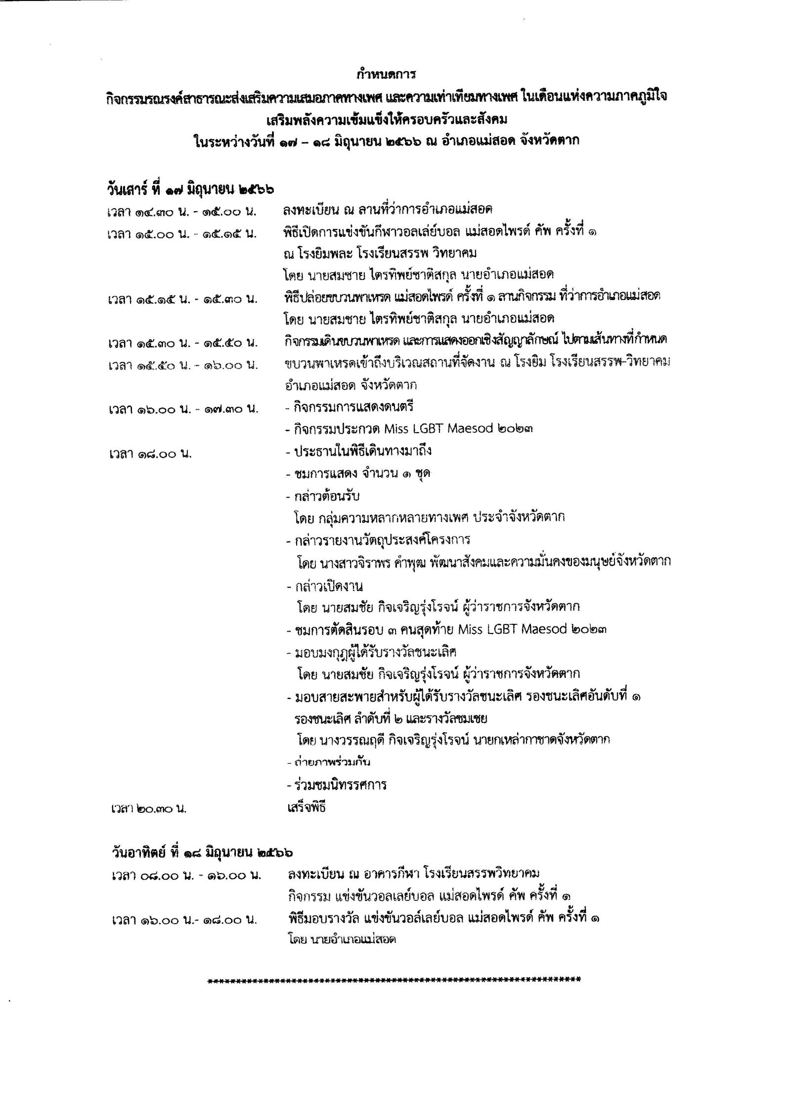 เทศบาลนครแม่สอด ขอเชิญร่วม กิจกรรมรณรงค์สาธารณะเพื่อส่งเสริมความเสมอภาคทางเพศและความเท่าเทียมทางเพศ ในเดือนแห่งความภาคภูมิใจ หรือ PRIDE MONTH จังหวัดตาก ประจำปี พ.ศ. 2566 "แม่สอดไพรด์ 2023" ครั้งที่ 1 ซึ่งจะจัดขึ้นในวันเสาร์ ที่ 17 มิถุนายน พ.ศ.2566