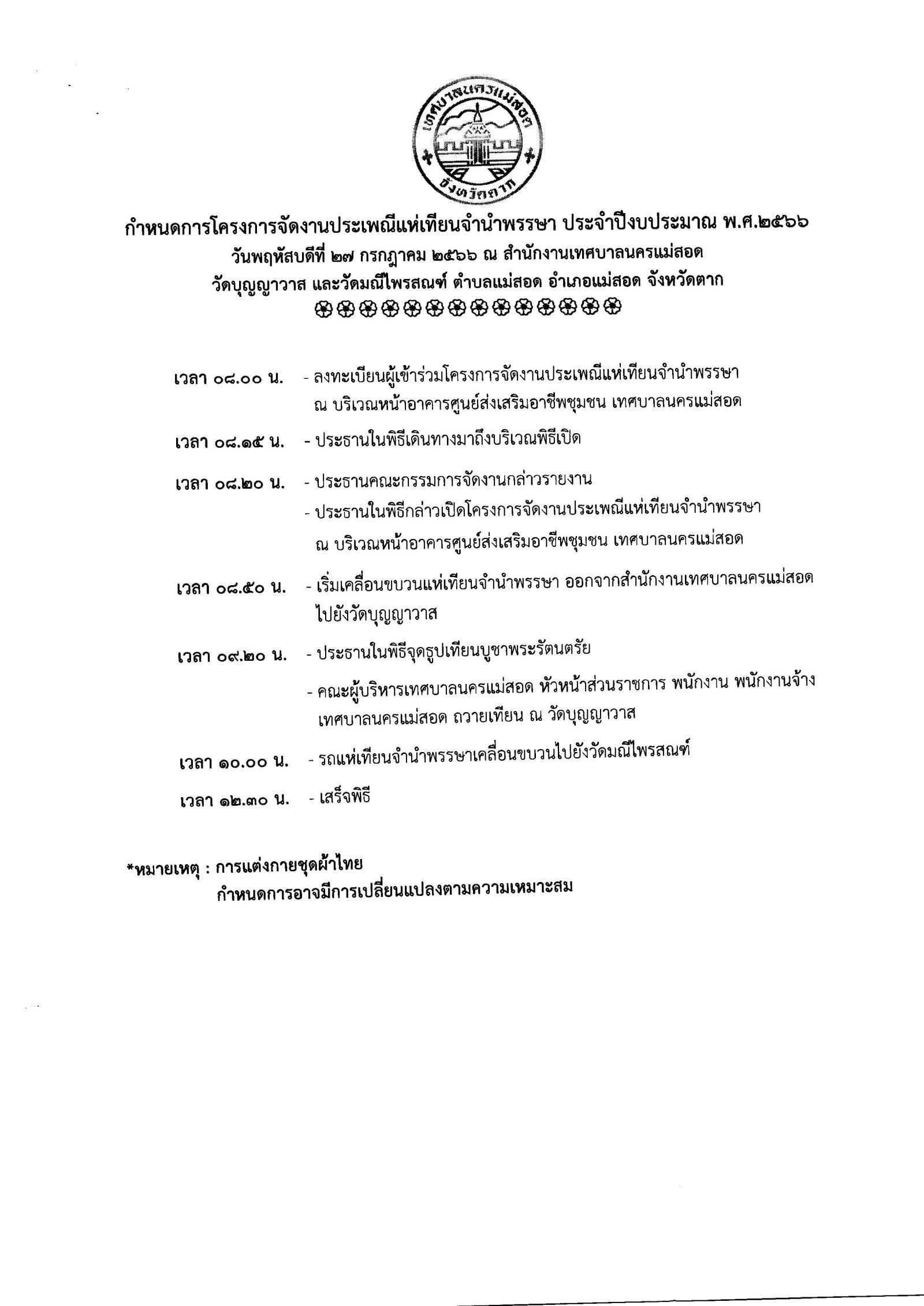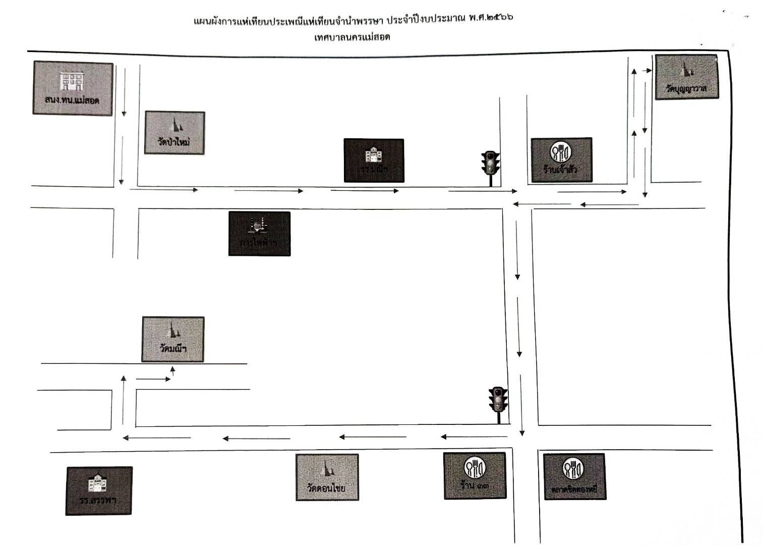 เทศบาลนครแม่สอดได้กำหนดจัดโครงการจัดงานประเพณีแห่เทียนพรรษา ประจำปีงบประมาณ 2566 ในวันพฤหัสบดี ที่ 27 กรกฏาคม 2566 เพื่อส่งเสริม สืบสาน วัฒนธรรมประเพณีอันดีงามของท้องถิ่น ปลูกฝังขนบธรรมเนียมประเพณีวัฒธรรม ให้แก่เด็ก เยาวชน และประชาชน รวมไปถึงสร้างความสัมพันธ์อันดี ความสามัคคีของคนในชุมชน โดยมีกำหนดการและแผนผังการแห่เทียนจำนำพรรษาตามเอกสารภาพด้านล่างนี้