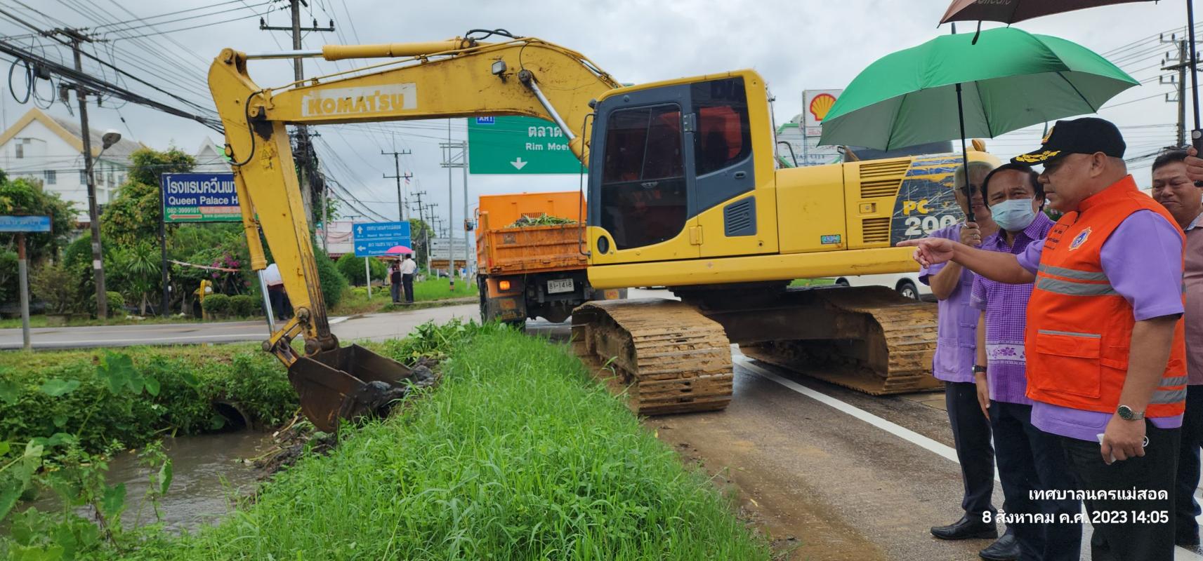 โดยมีนายวีระพันธ์ ดีอ่อน รองผู้ว่าราชการจังหวัดตาก , เลขานุการนายกอบจ.ตาก , สจ.และเจ้าหน้าที่ที่เกี่ยวข้อง ลงพื้นที่ติดตามสถานการณ์น้ำท่วมในเขตเทศบาลนครแม่สอด พร้อมนำรถแบคโฮ และรถบรรทุกขนดิน ดำเนินการขุดลอกทางระบายน้ำบริเวณถนนสายเอเชีย ตั้งแต่แยกถนนวัดป่าใหม่ถึงแยกถนนเยลลี่อุทิศ ชุมชนจ๊อกจอสามัคคี เพื่อเปิดทางระบายน้ำให้ไหลลงสู่คลองธรรมชาติ เพื่อแก้ไขปัญหาน้ำท่วมขัง และบรรเทาความเดือดร้อนให้กับประชาชน
