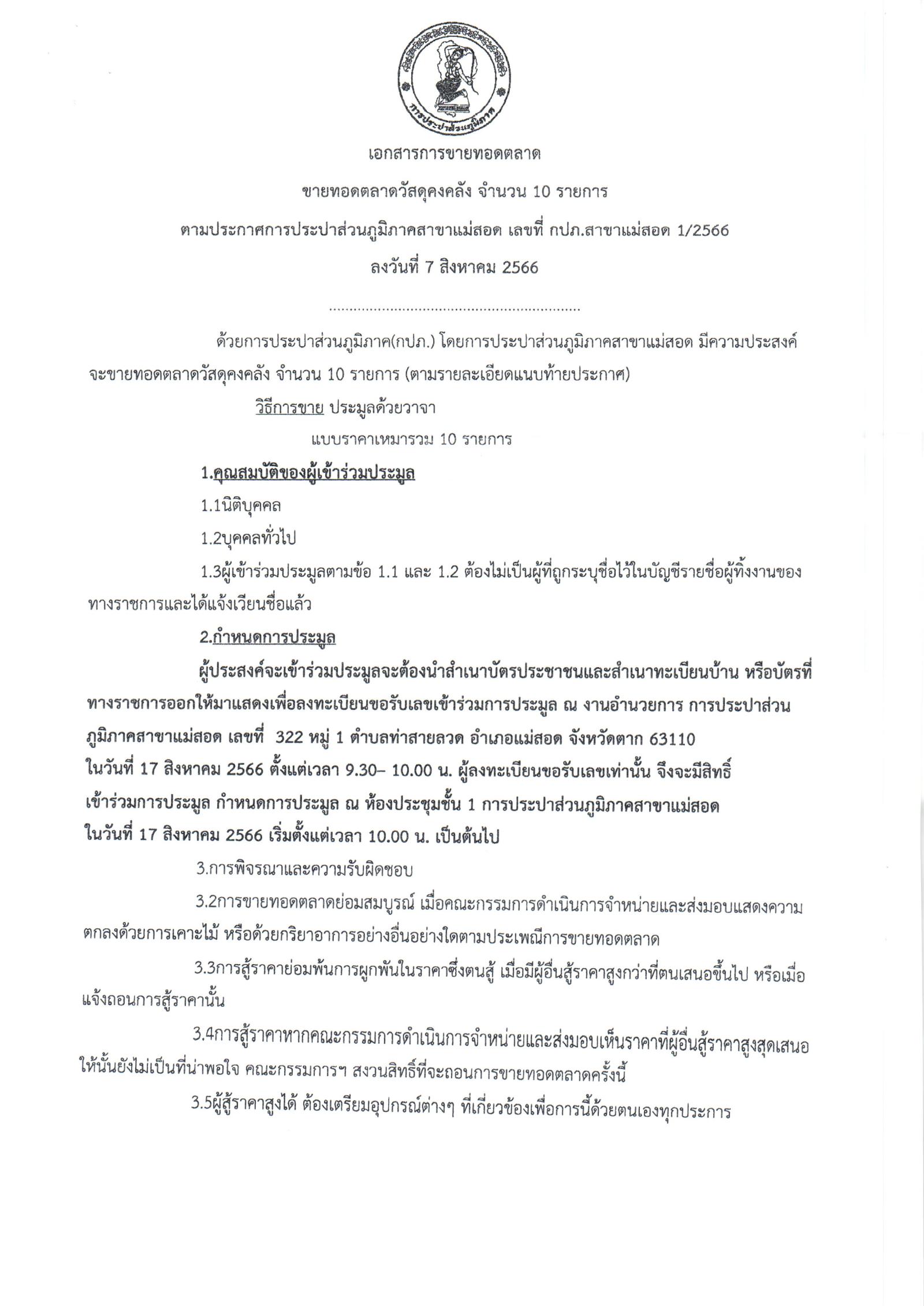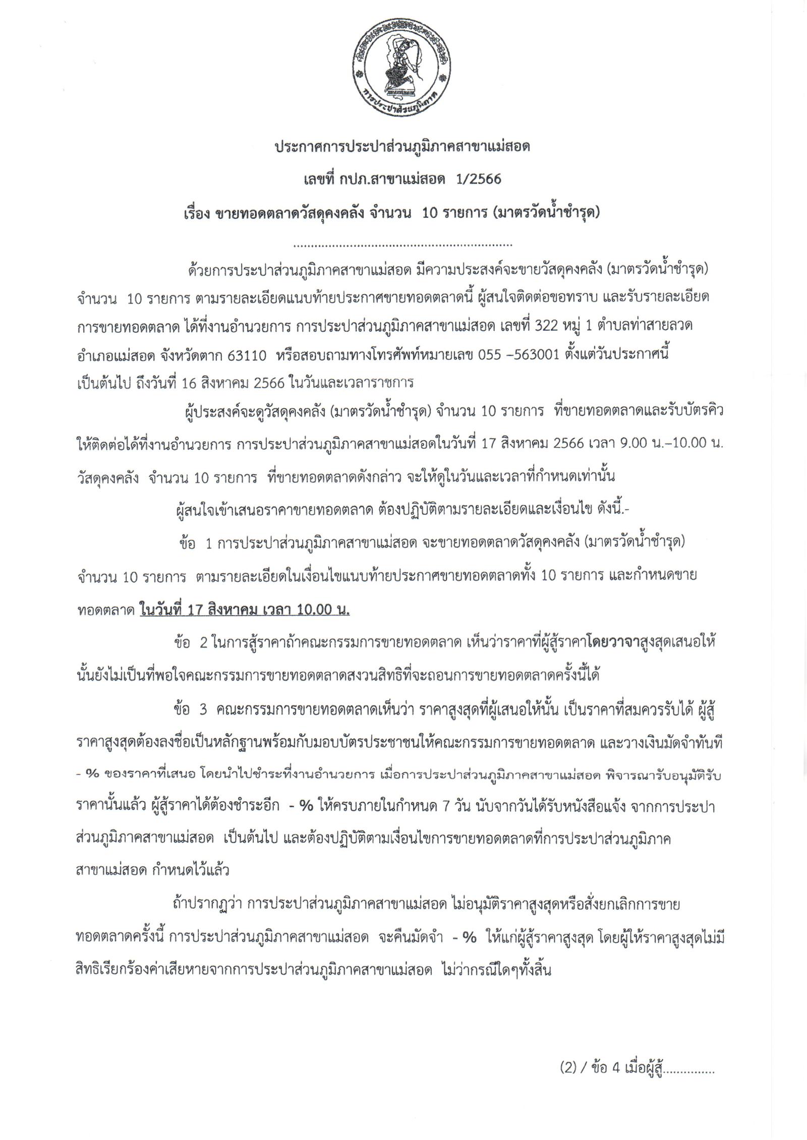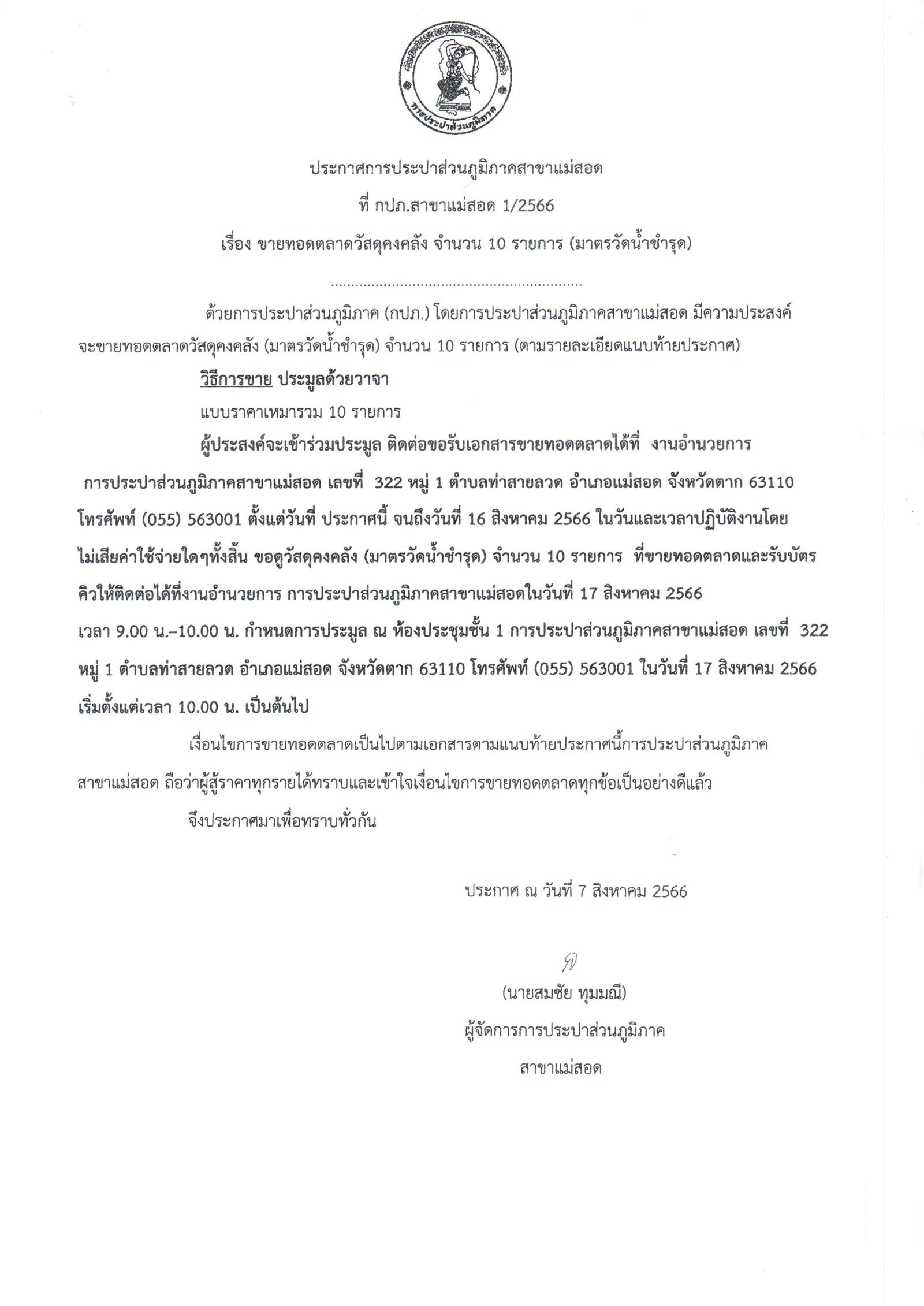 ประกาศการประปาส่วนภูมิภาคสาขาแม่สอด ที่ ขายทอดตลาดวัสดุคงคลัง จำนวน 10 รายการ (มาตรวัดน้ำชำรุด)