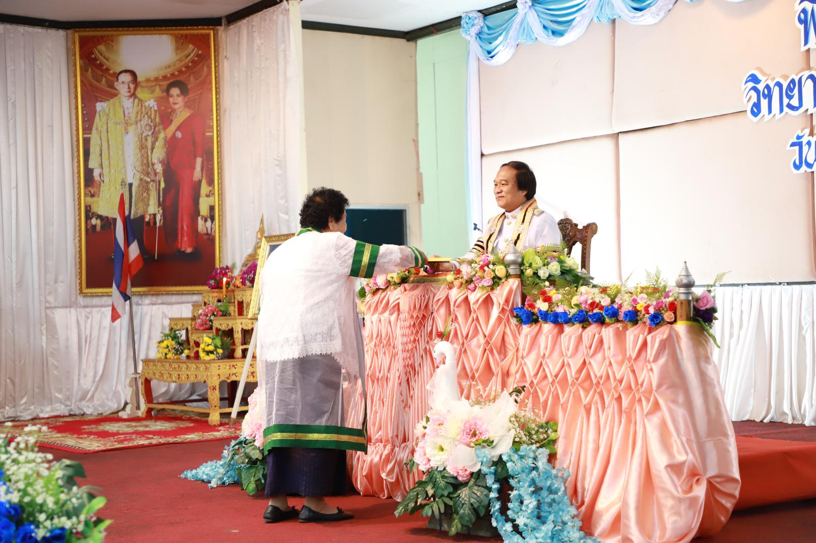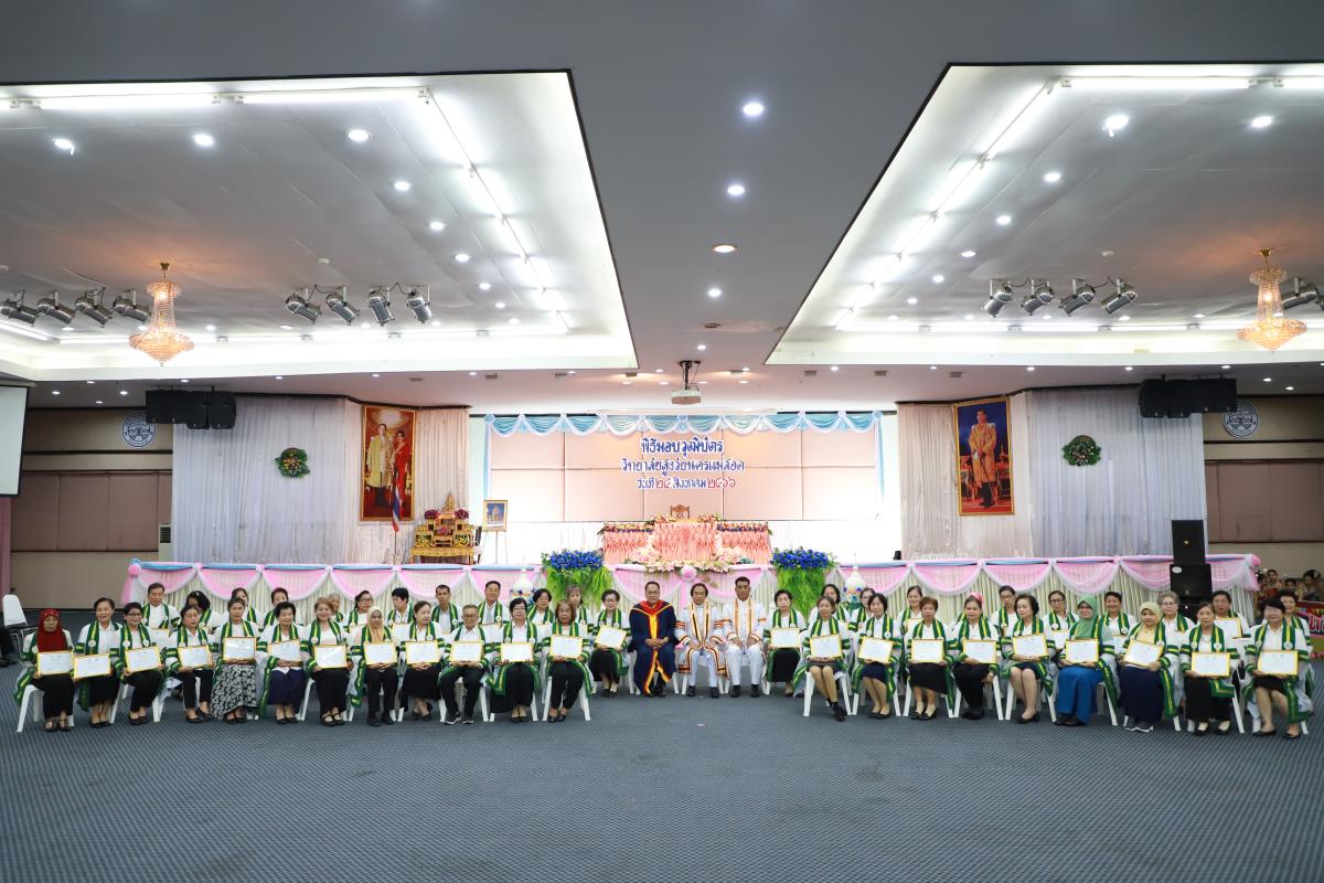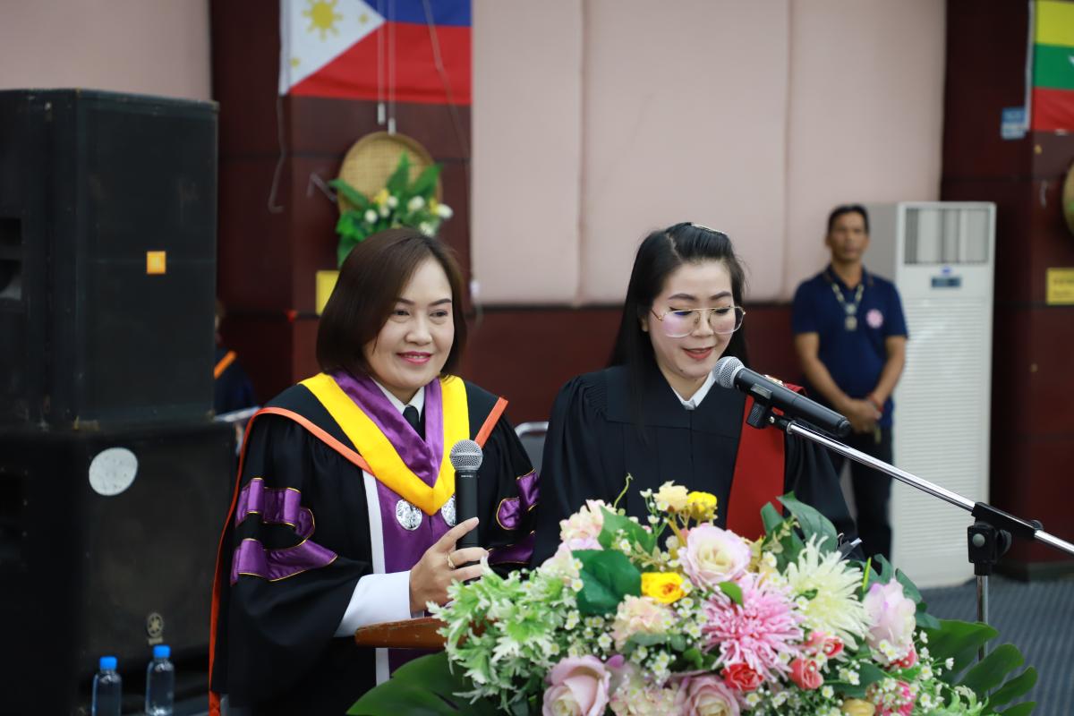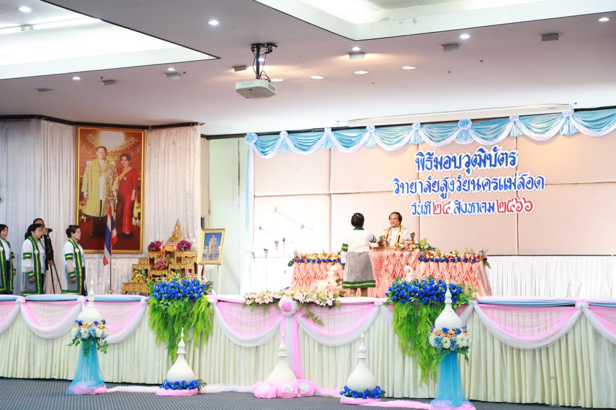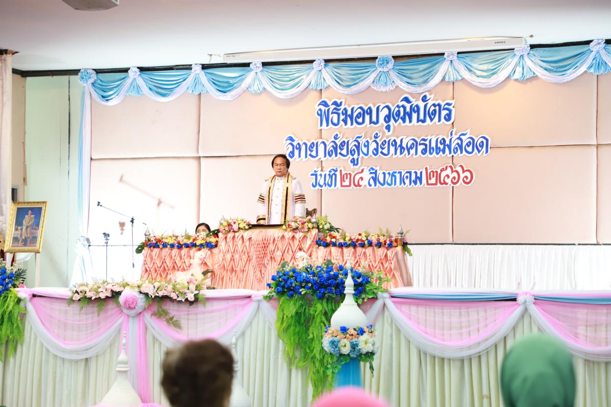 โดยจ่าเอก มานะ มูลพิจิตร ผู้อำนวยการกองสวัสดิการสังคมและผู้อำนวยการวิทยาลัยสูงวัยนครแม่สอด เป็นผู้กล่าวรายงาน ซึ่งวิชชาลัยสูงวัยนครแม่สอดได้ดำเนินกิจกรรม ภายใต้ “โครงการส่งเสริมสุขภาพผู้สูงอายุ สร้างจิตสดใส ร่างกายแข็งแรง” เพื่อการมีภาวะอารมณ์ที่ดี ลดภาวะเครียด สร้างกำลังใจในการดำเนินชีวิต สร้างระบบภูมิคุ้มกันสุขภาพในด้านต่าง ๆ และยกระดับคุณภาพชีวิตให้กับผู้สูงอายุ ซึ่งได้รับความร่วมมือจากทีมวิทยากรภาคีเครือข่ายทุกภาคส่วน ผ่านกระบวนการจัดกิจกรรมกลุ่ม ทั้ง 12 กิจกรรม โดยมีผู้ที่สำเร็จการศึกษาในครั้งนี้จำนวนทั้งสิ้น 48 คน
