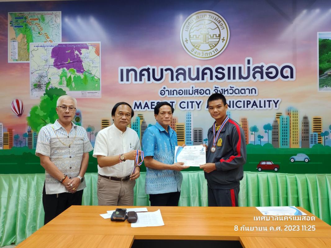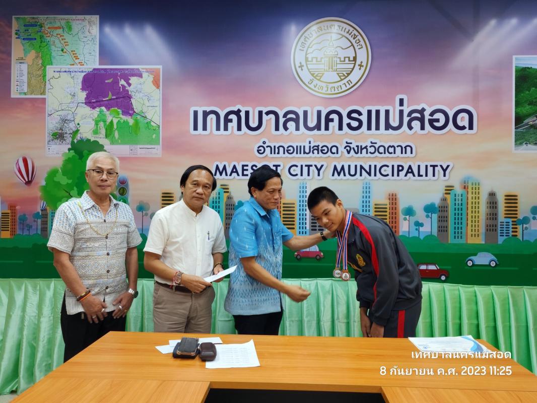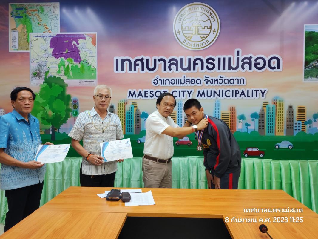 ว่าที่ร้อยตรี ประเสริฐ ปวงละคร นายกเทศมนตรีนครแม่สอด พร้อมด้วยคณะผู้บริหาร สมาชิกสภาเทศบาล ผู้อำนวยการสถานศึกษาและครู เข้าร่วมแสดงความยินดี พร้อมมอบโอวาทแก่นักเรียนที่คว้าเหรียญจากการแข่งขัน “กรีฑาดาวรุ่งมุ่งโอลิมปิก เยาวชน –ยุวชน ชิงชนะเลิศแห่งประเทศไทย ประจำปี 2566” ระหว่าง วันที่ 1 - 4 กันยายน พ.ศ. 2566 ณ ศูนย์กรีฑาแห่งชาติ จังหวัดปทุมธานี โดยมีผลการแข่งขันดังนี้