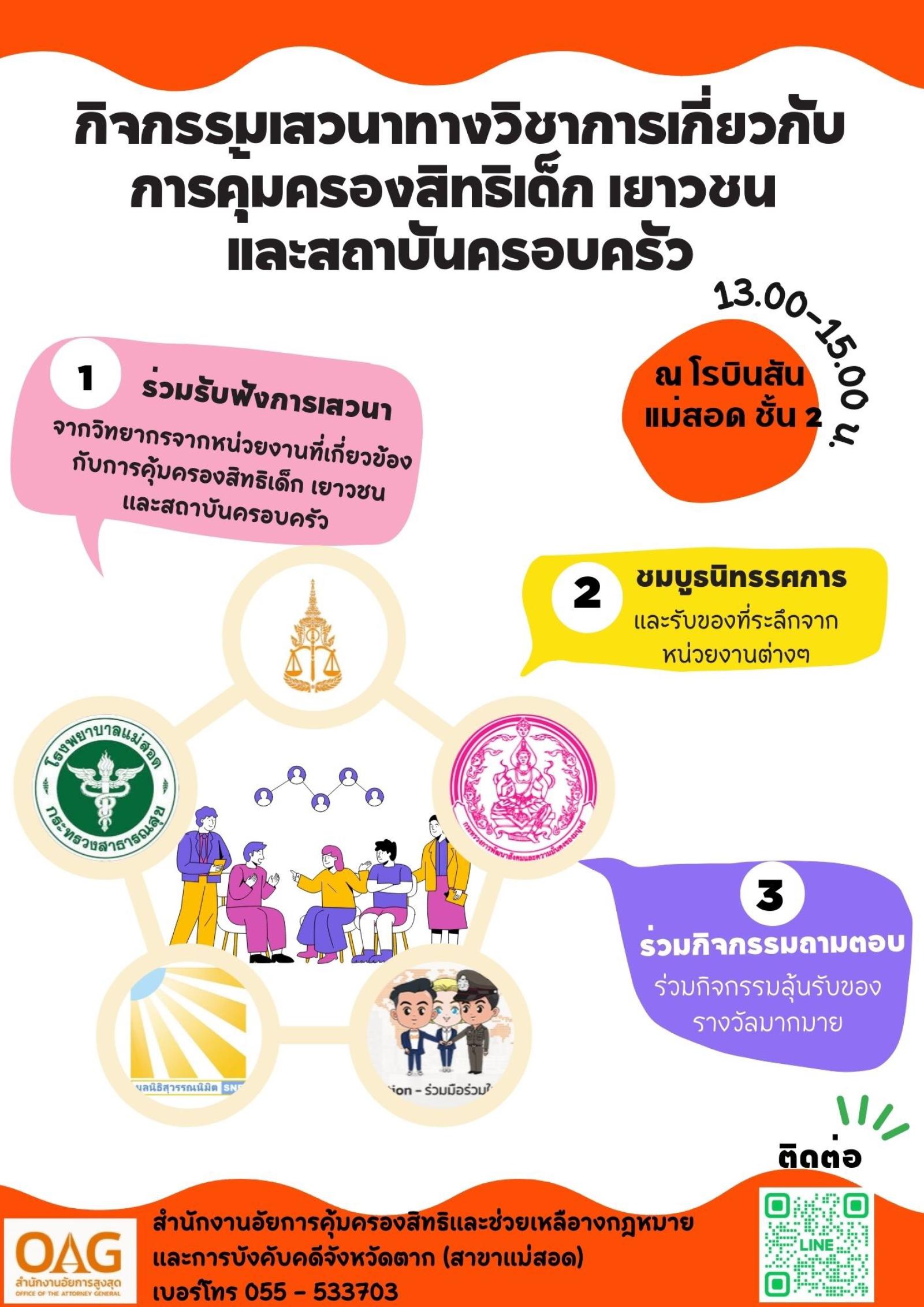 สำนักงานอัยการคุ้มครองสิทธิและช่วยเหลือทางกฎหมายและบังคับคดีจังหวัดตาก (สาขาแม่สอด) จัดกิจกรรมเสวนาทางวิชาการเกี่ยวกับการคุ้มครองสิทธิเด็ก เยาวชน และสถาบันครอบครัว โดยมีวิทยากรจากหลายหน่วยงาน เช่น สำนักงานพัฒนาสังคมและความมั่นคงของมนุษย์จังหวัดตาก บ้านพักเด็กจังหวัดตาก โรงพยาบาลแม่สอด สถานีตำรวจภูธรแม่สอด ผู้ที่สนใจสามารถเข้าร่วมชมบูธนิทรรศการและรับของที่ระลึกภายในงาน กิจกรรมดังกล่าวจัดขึ้นในวันที่ 16 กันยายน 2566 ตั้งแต่เวลา 13.00 - 15.00 นาฬิกา บริเวณลานชั้น 2 ห้างสรรพสินค้าโรบิลสันแม่สอด