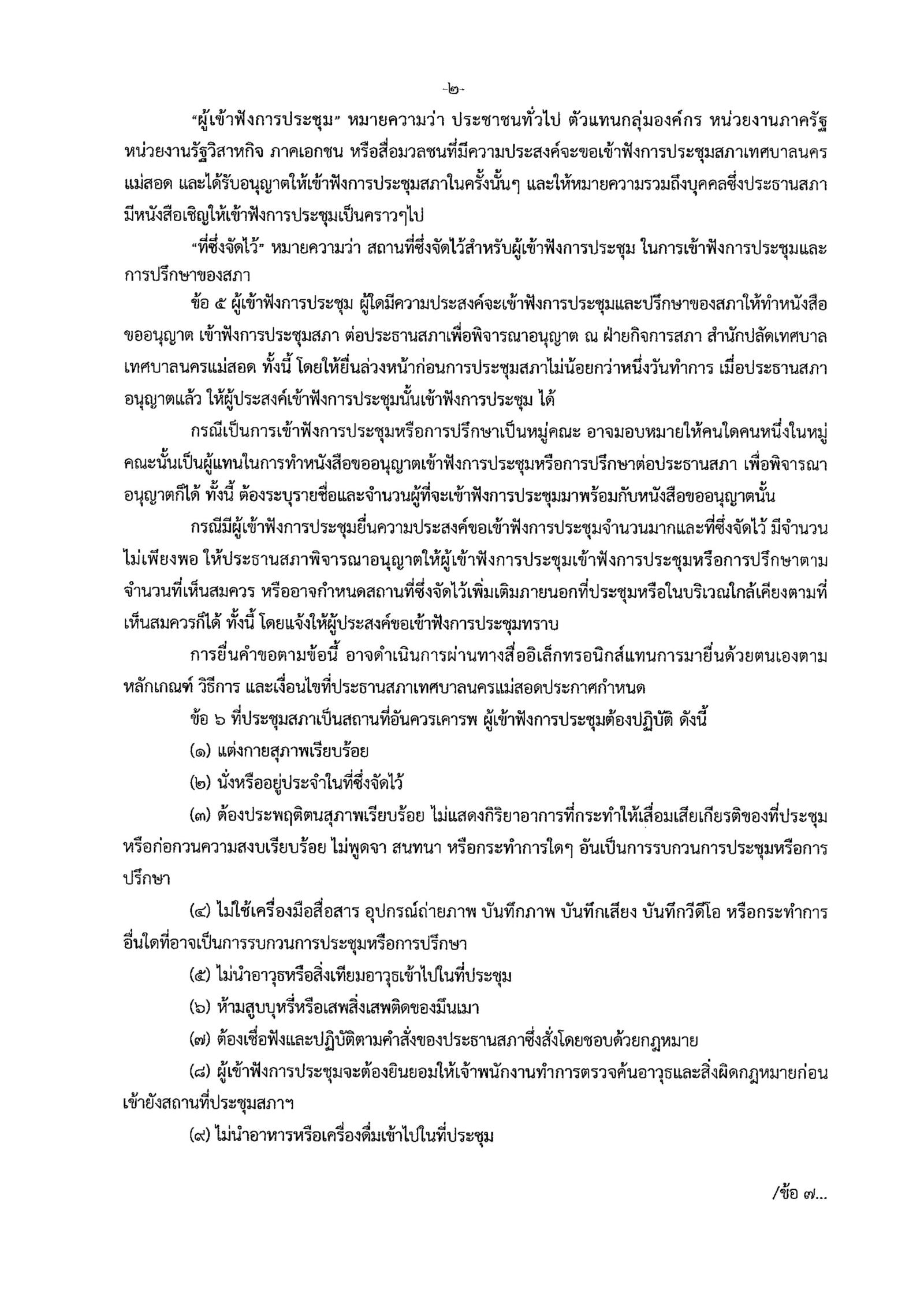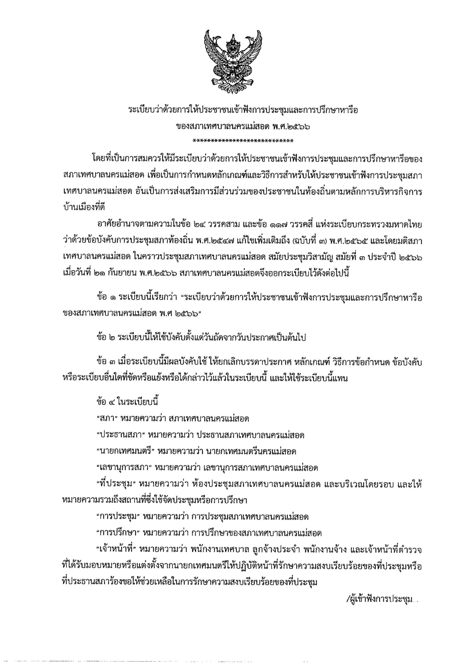 ประกาศสภาเทศบาลนครแม่สอด เรื่อง ใช้ระเบียบสภาเทศบาลนครแม่สอด ว่าด้วยการให้ประชาชนเข้าฟังการประชุมและการปรึกษาหารือของสภาเทศบาลนครแม่สอด พ.ศ.2566