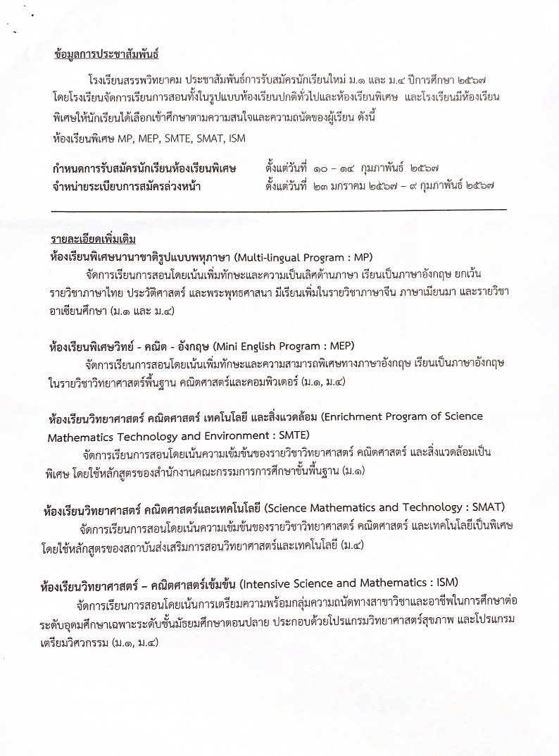 เทศบาลนครแม่สอดประชาสัมพันธ์ขอแจ้ง ด้วยโรงเรียนสรรพวิทยาคม ได้เปิดรับสมัครนักเรียนใหม่ ระดับชั้นมัธยมศึกษาปีที่ 1 และ มัธยมศึกษาปีที่ 4 ประจำปีการศึกษา 2567 โดยโรงเรียนจัดการเรียนการสอนทั้งในรูปแบบห้องเรียนปกติ และห้องเรียนพิเศษให้นักเรียนได้เลือกศึกษาตามความสนใจและความถนัดของผู้เรียน