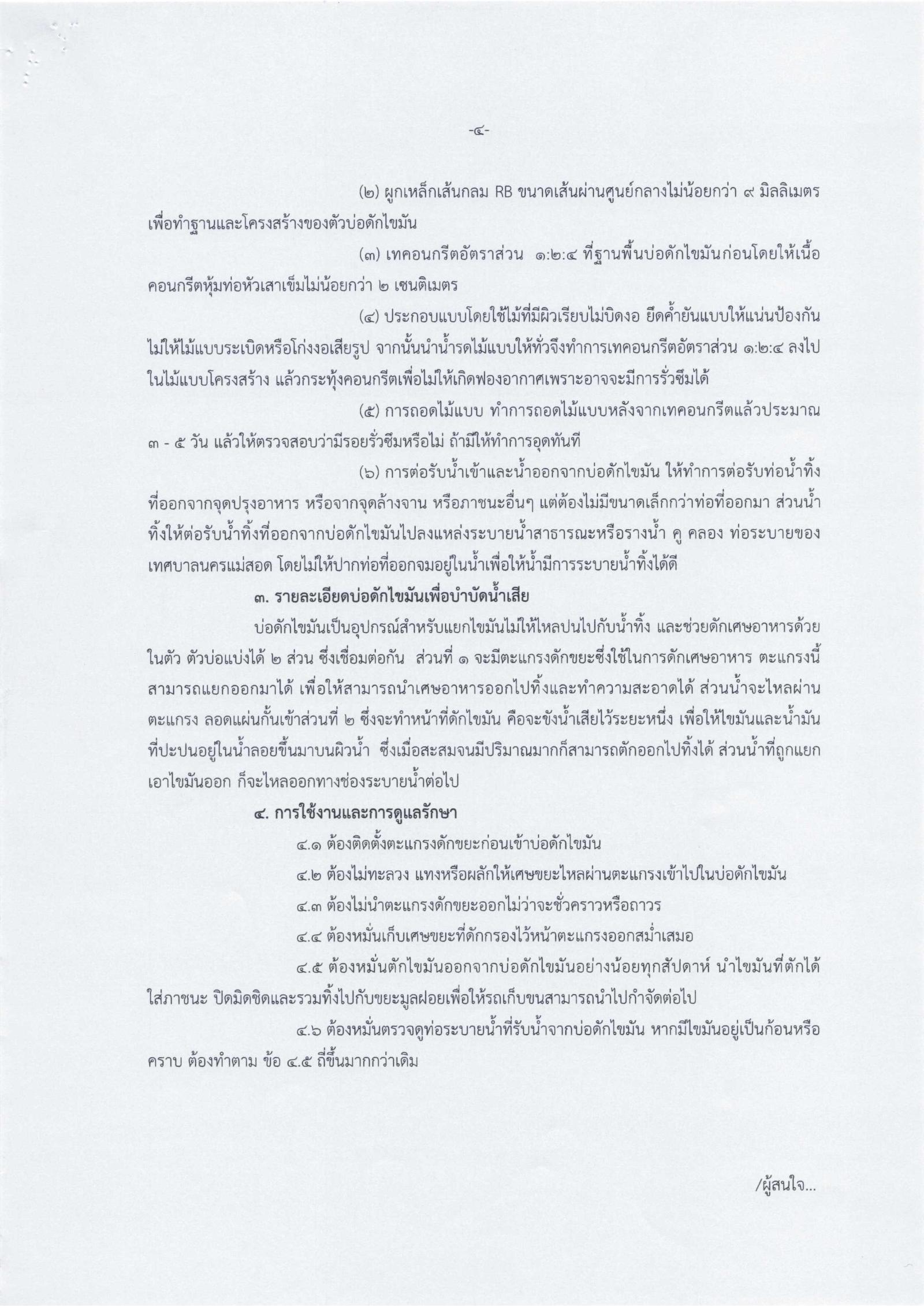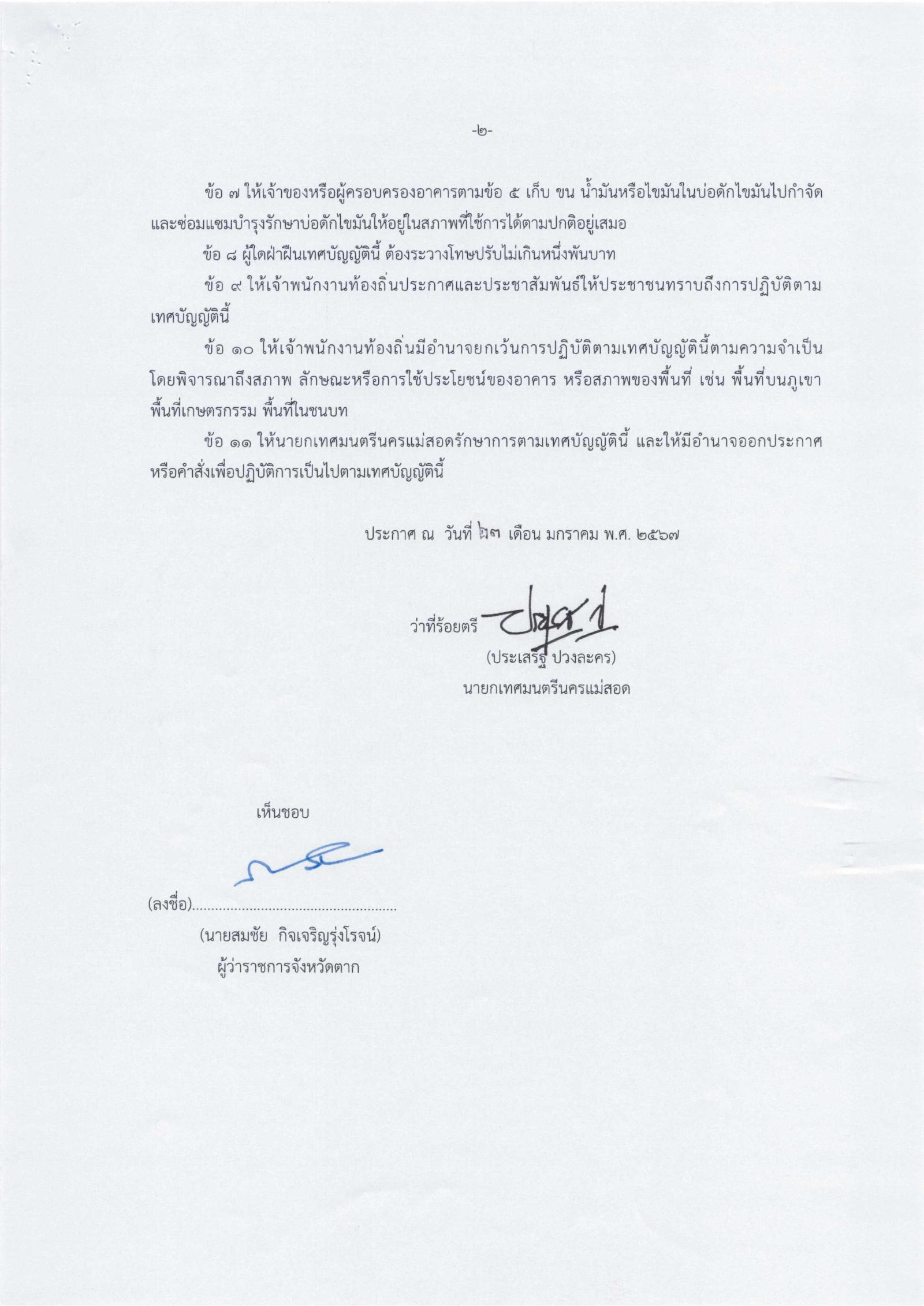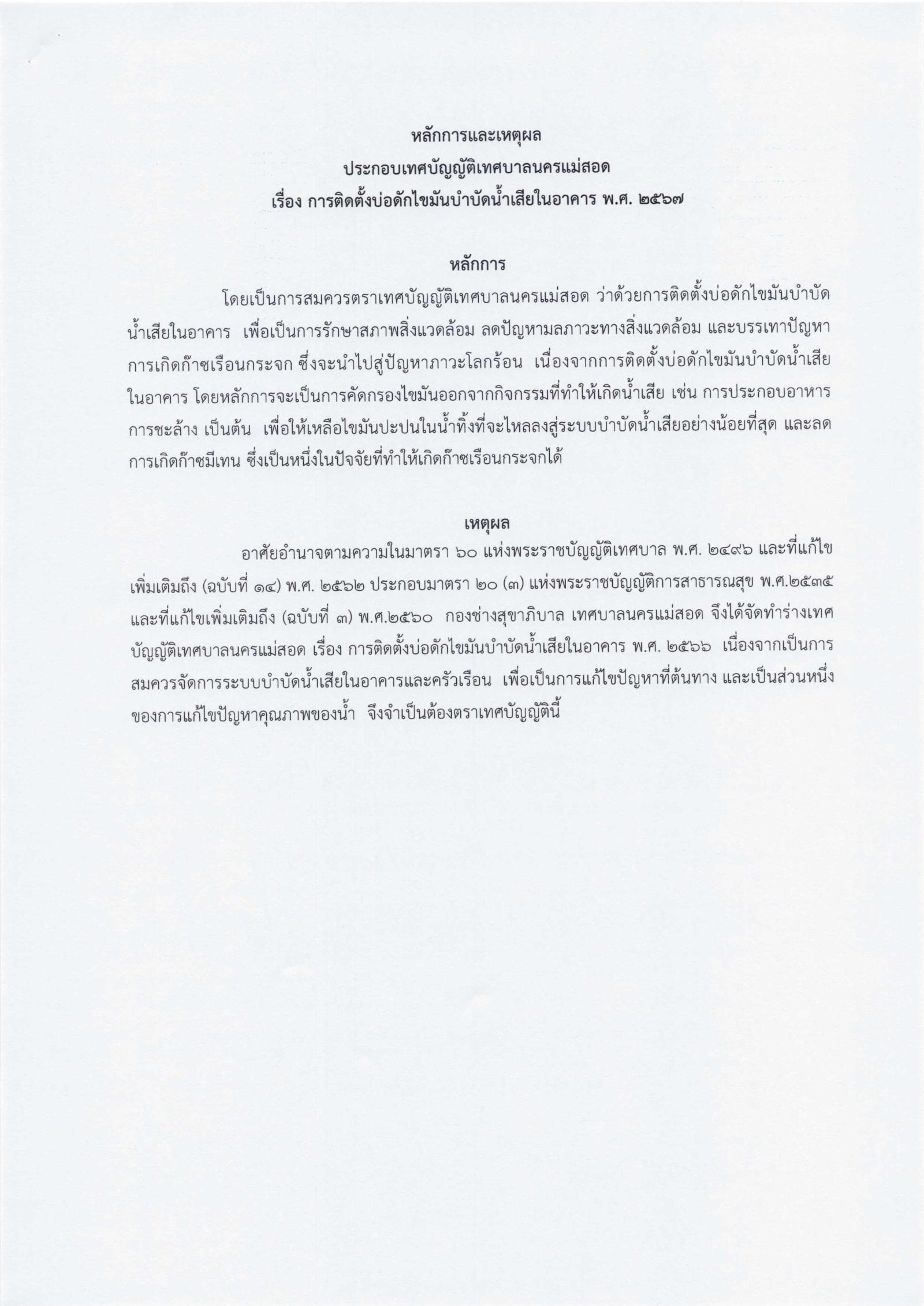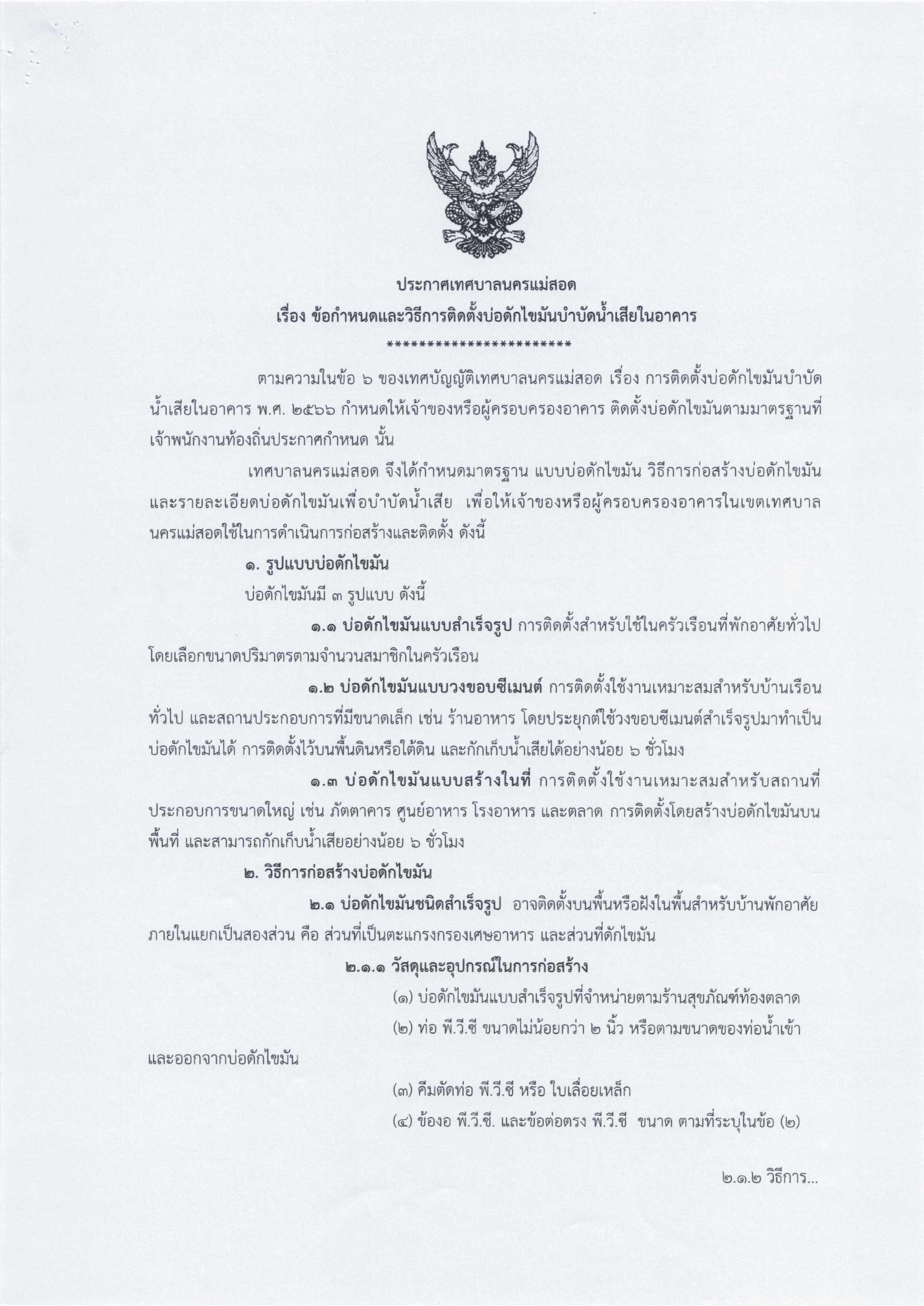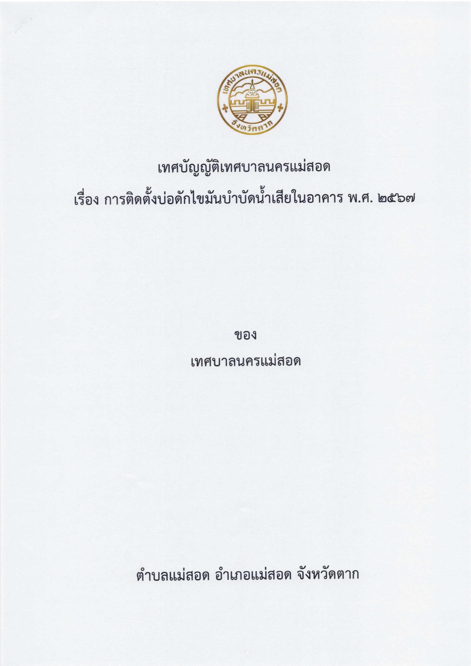 เทศบัญญัติเทศบาลนครแม่สอด เรื่อง การติดตั้งบ่อดักไขมันบำบัดน้ำเสียในอาคาร พ.ศ. 2567 และ ประกาศเทศบาลนครแม่สอด เรื่อง ข้อกำหนดและวิธีการติดตั้งบ่อดักไขมันบำบัดน้ำเสียในอาคาร