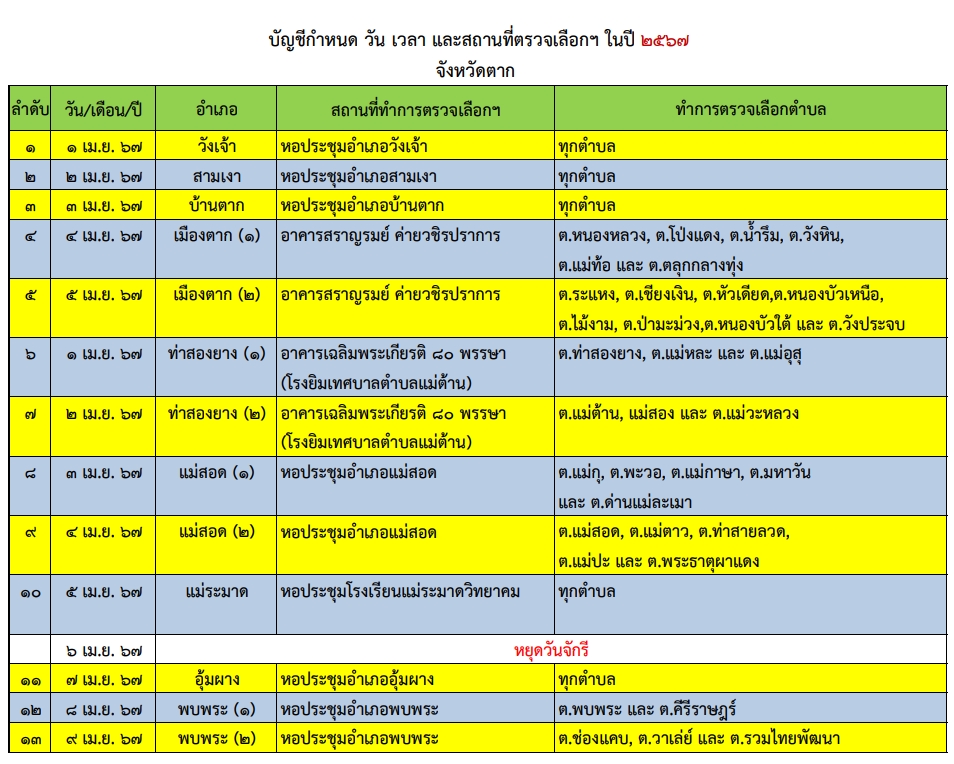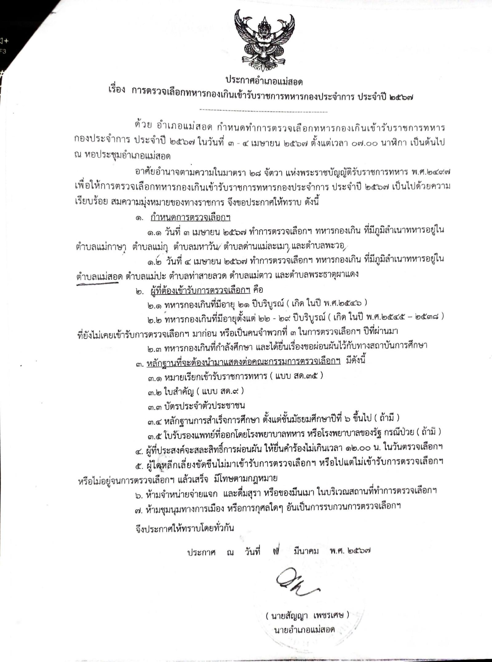 เทศบาลนครแม่สอด ขอประชาสัมพันธ์ วัน เวลา และสถานที่ตรวจเลือกทหารกองเกินเข้ารับราชการทหารกองประจำการ ประจำปี 2567 อำเภอแม่สอด