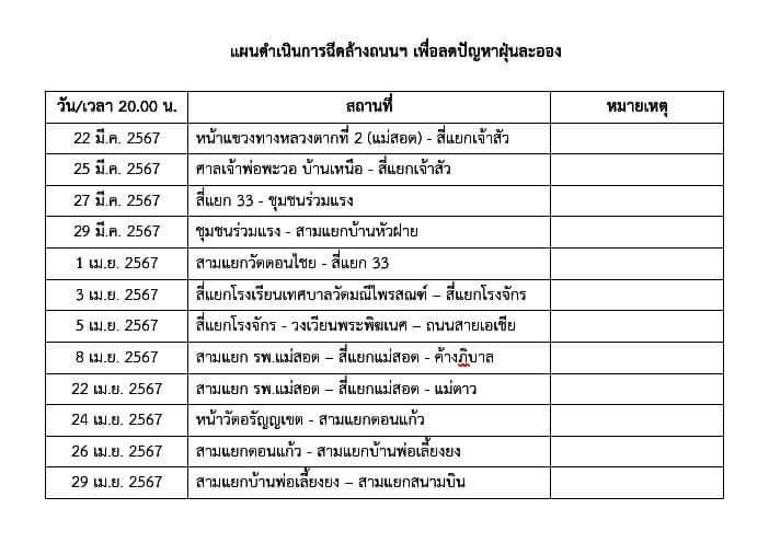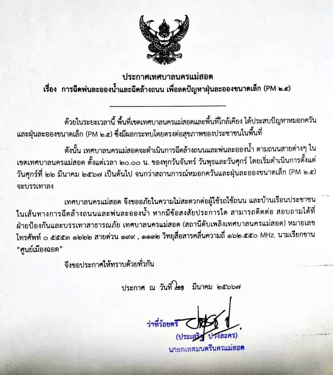 ประกาศเทศบาลนครแม่สอด เรื่อง การฉีดพ่นละอองน้ำและฉีดล้างถนน เพื่อลดปัญหาฝุ่นละอองขนาดเล็ก (PM 2.5)