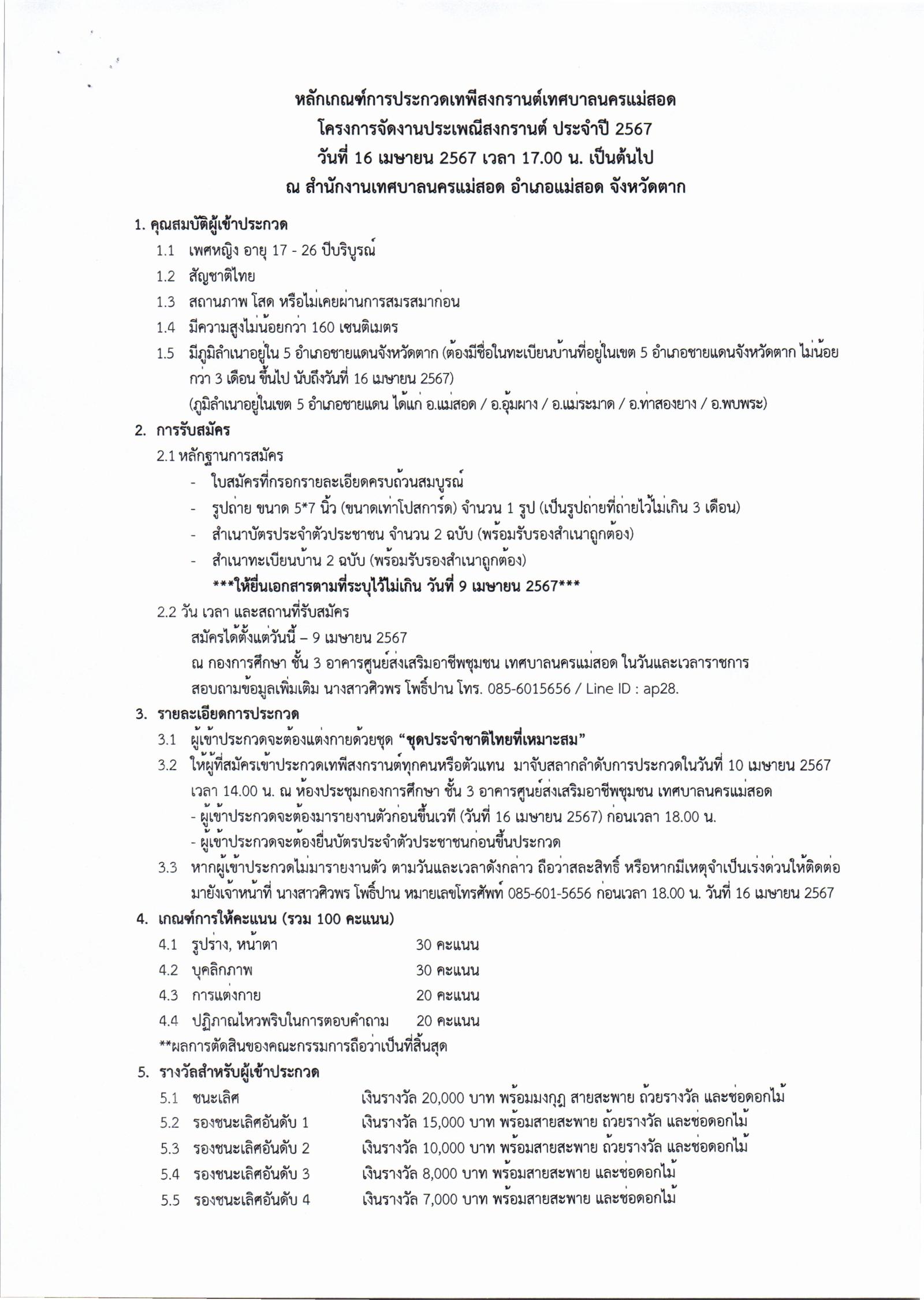 เทศบาลนครแม่สอด ขอประชาสัมพันธ์การประกวดธิดาลูกหลานพระเจ้าตากในงานประเพณีงานตากสินมหาราชานุสรณ์ ประจำปี 2568 - 2569