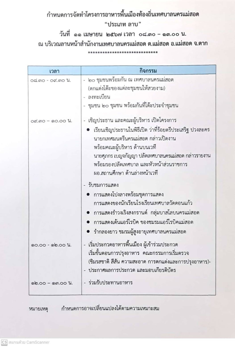 เทศบาลนครแม่สอด ขอเชิญร่วมงานอาหารพื้นเมืองท้องถิ่นเทศบาลนครแม่สอด ในวันที่ 11 เมษยน 2567