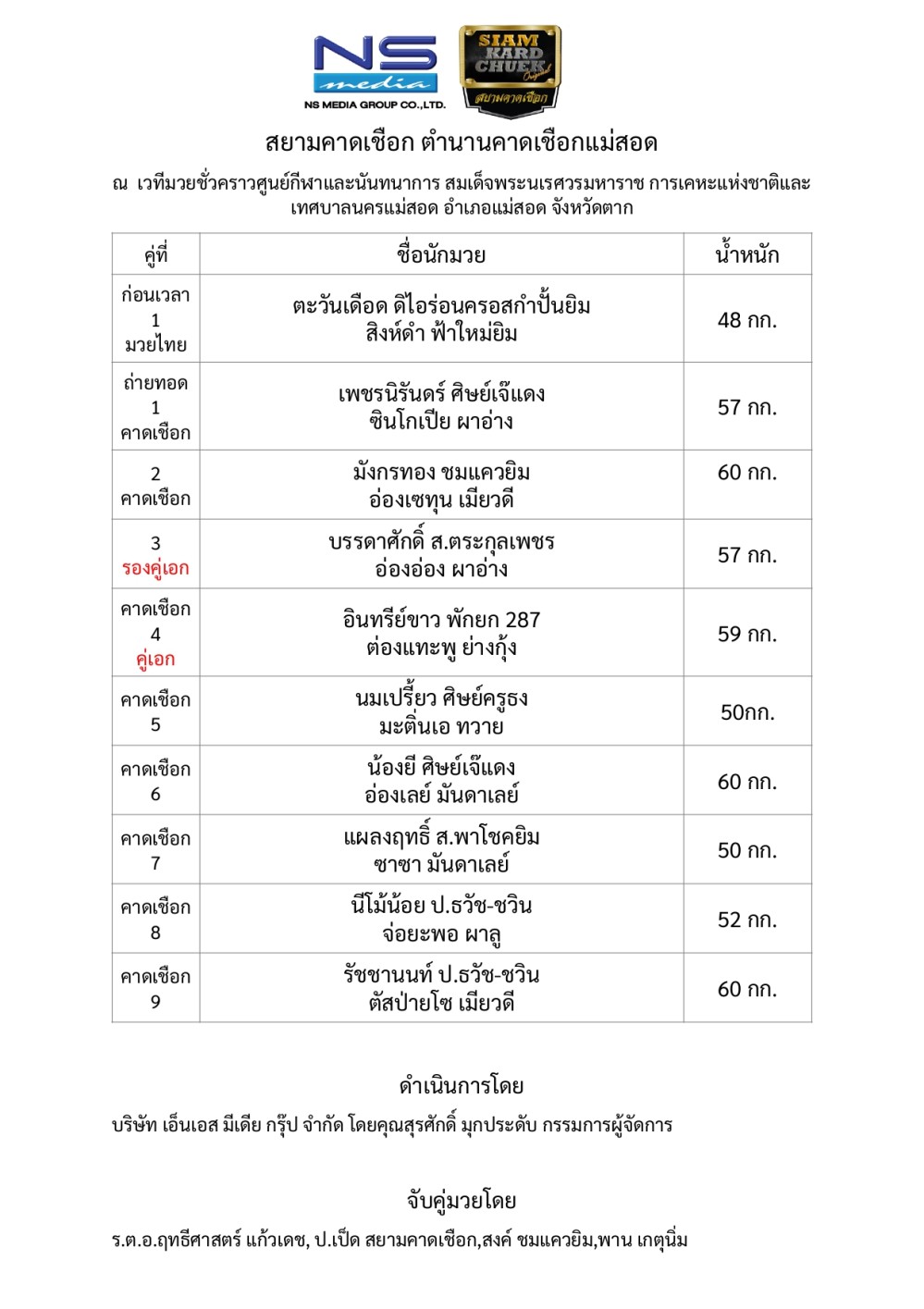 ห้ามพลาด วันศุกร์ที่ 12 เมษายน 2567 ถ่ายทอดสดศึกมวยสยามคาดเชือก ตำนานคาดเชือกแม่สอด ผ่านทางช่อง 8 เวลา 17.10 - 18.55 น.