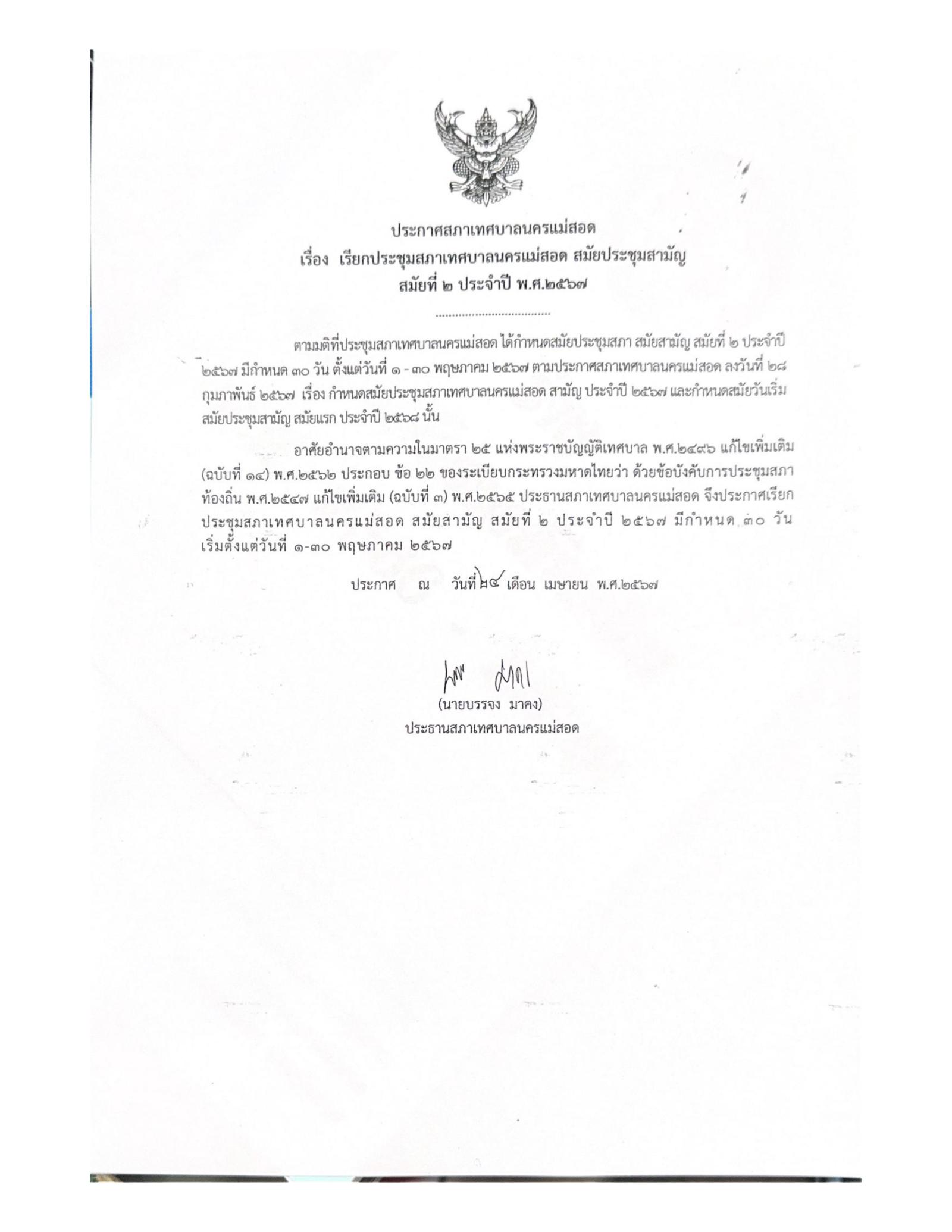 ประกาศสภาเทศบาลนครแม่สอด เรื่อง เรียกประชุมสภาเทศบาลนครแม่สอด สมัยประชุมสามัญ สมัยที่2 ประจำปี พ.ศ.2567
