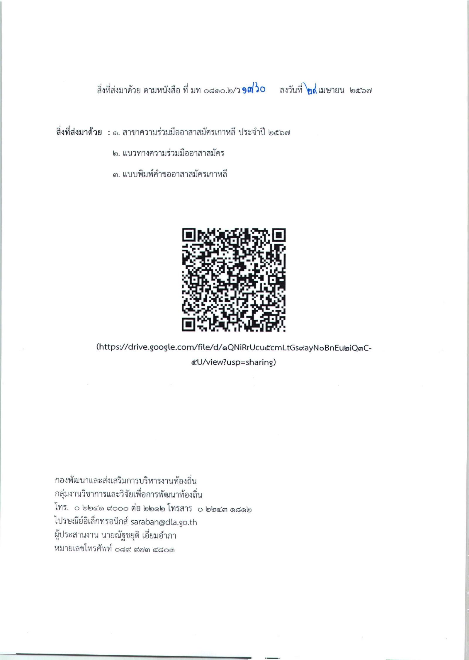 ตามที่กรมส่งเสริมการปกครองส่วนท้องถิ่นได้ขอความร่วมมือจังหวัดประชาสัมพันธ์การเปิดรับสมัคร ข้อเสนอคำขออาสาสมัครเกาหลี ประจำปี ๒๕๖๗ เทศบาลนครแม่สอดจึงขอประชาสัมพันธ์ให้องค์กรปกครองส่วนท้องถิ่น ที่มีความประสงค์จะขอรับอาสาสมัครเกาหลี ให้จัดทำข้อเสนอคำขออาสาสมัครเกาหลีเป็นภาษาอังกฤษ โดยจัดส่งให้กองพัฒนาและส่งเสริมการบริหารงานท้องถิ่น กรมส่งเสริมการบริหารงานท้องถิ่น กรมส่งเสริมการปกครองท้องถิ่น รายละเอียดเพิ่มเติมตามเอกสารด้านล่างนี้