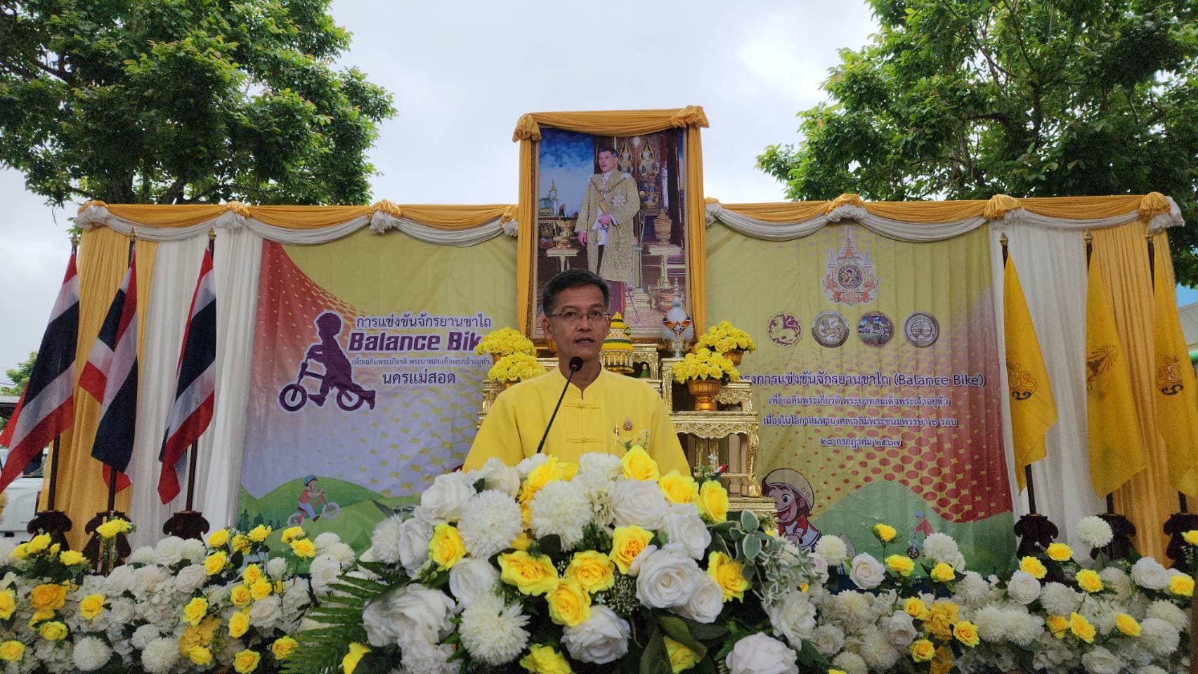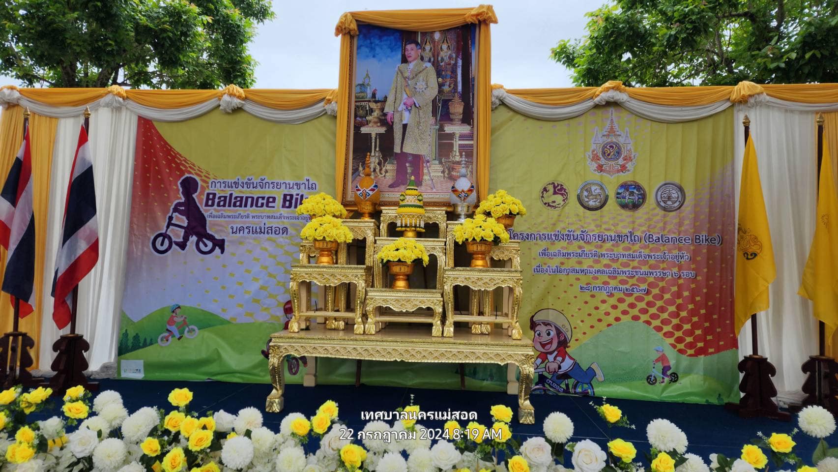 ว่าที่ร้อยตรี ประเสริฐ ปวงละคร นายกเทศมนตรีนครแม่สอด พร้อมด้วย คณะผู้บริหาร สมาชิกสภาเทศบาล หัวหน้าส่วนราชการ และพนักงานเทศบาลนครแม่สอด จัดการแข่งขันจักรยานขาไถ (Balance Bike) เฉลิมพระเกียรติ พระบาทสมเด็จพระเจ้าอยู่หัว เนื่องในโอกาสพระราชพิธีมหามงคลเฉลิมพระชนมพรรษา 6 รอบ 28 กรกฎาคม 2567 จังหวัดตาก โดยได้รับเกียรติจาก นายสุรพล วงศ์สุขพิศาล รองผู้ว่าราชการจังหวัดตาก เป็นประธานในพิธี พร้อมด้วย หัวหน้าส่วนราชการ หน่วยงานรัฐวิสาหกิจ องค์กรปกครองส่วนท้องถิ่น ภาคเอกชน และประชาชนในพื้นที่ เข้าร่วมโครงการฯ โดยมีวัตถุประสงค์การจัดการแข่งขันจักรยานขาไถ (Balance Bike) เฉลิมพระเกียรติฯ เพื่อน้อมสำนึกในพระมหากรุณาธิคุณ พระบาทสมเด็จพระเจ้าอยู่หัว เนื่องในโอกาสพระราชพิธีมหามงคลเฉลิมพระชนมพรรษา 6 รอบ 28 กรกฎาคม 2567 และเพื่อส่งเสริมสนับสนุนให้เด็กปฐมวัยได้ออกกำลังกาย เพื่อพัฒนาการที่สมวัยรอบด้าน สุขภาพสมบูรณ์แข็งแรง และใช้เวลาว่างให้เกิดประโยชน์ ตลอดจนเป็นการประชาสัมพันธ์แหล่งท่องเที่ยวที่สำคัญในพื้นที่ สัมผัสวิถีชีวิตชุมชนท้องถิ่น กระตุ้นเศรษฐกิจฐานรากให้เกิดรายได้ในระดับครัวเรือนและชุมชน