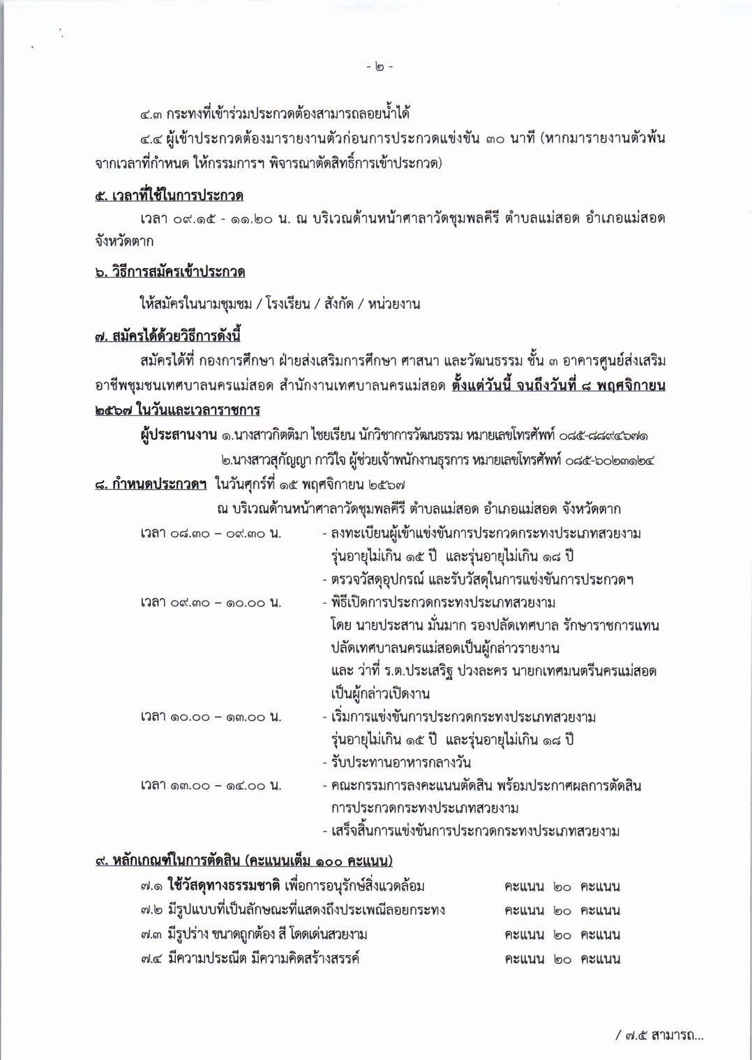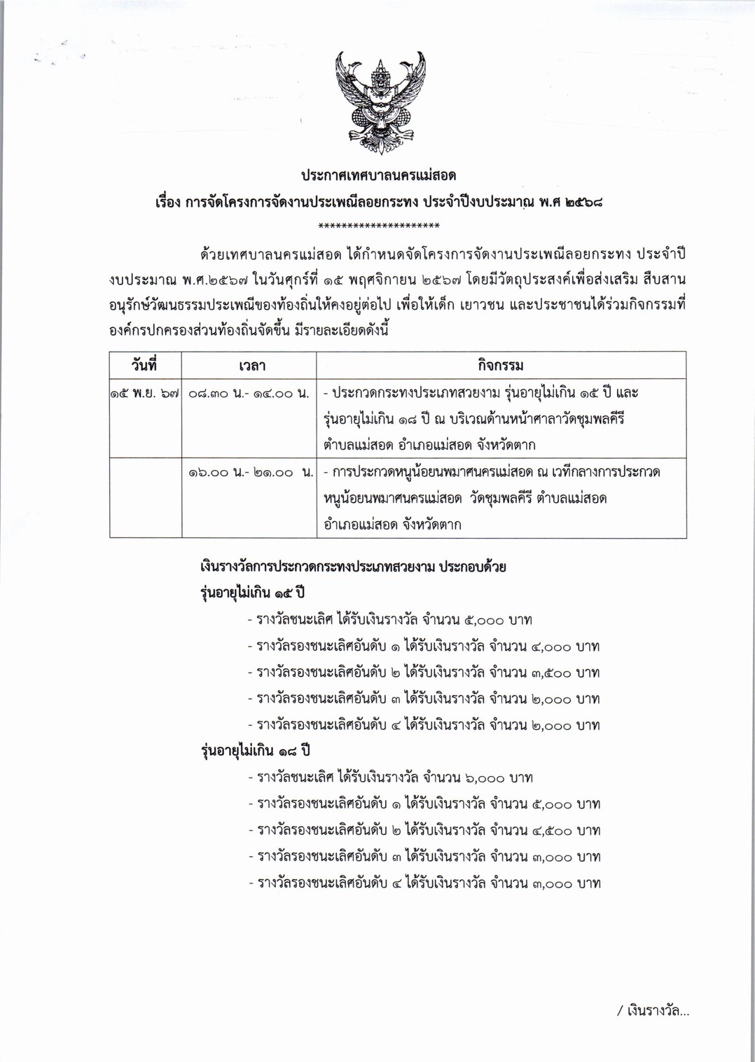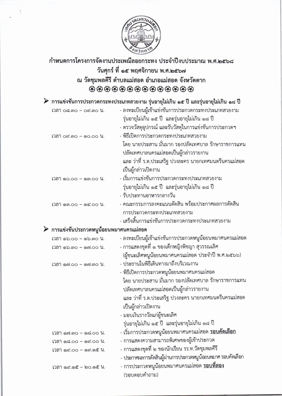 การจัดโครงการจัดงานประเพณีลอยกระทง ประจำปีงบประมาณ พ.ศ. 2568 ในวันศุกร์ที่ 15 พฤศจิกายน 2567 (เชิญชวนผู้ที่สนใจเข้าร่วมกิจกรรมฯ) ดังนี้ 1. ประกวดกระทงประเภทสวยงาม รุ่นไม่เกิน 15 ปี และไม่เกิน 18 ปี 2. การประกวดหนูน้อยนพมาศนครแม่สอด โดยเปิดรับสมัคร ตั้งแต่บัดนี้ ถึง วันที่ 8 พฤศจิกายน 2567 *กำหนดการโครงการฯ *หลักเกณฑ์การประกวดกระทงสวยงาม/ใบสมัครเข้าร่วมประกวดกระทง *หลักเกณฑ์การประกวดหนูน้อยนพมาศนครแม่สอด/ใบสมัครเข้าร่วมประกวดหนูน้อยนพมาศนครแม่สอด รายละเอียดดาวน์โหลดได้ตามเอกสารด้านล่างนี้
