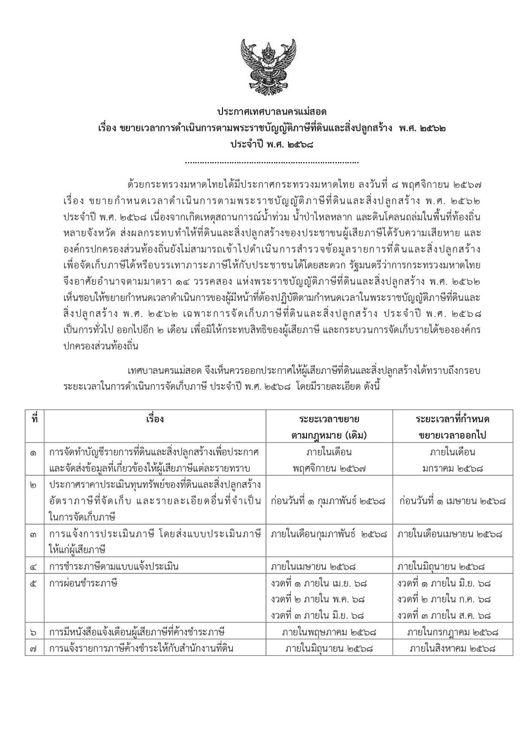 ประกาศเทศบาลนครแม่สอด เรื่อง ขยายเวลาการดำเนินการตามพระราชบัญญัติภาษีที่ดินและสิ่งปลูกสร้าง พ.ศ. 2562 ประจำปี พ.ศ. 2568