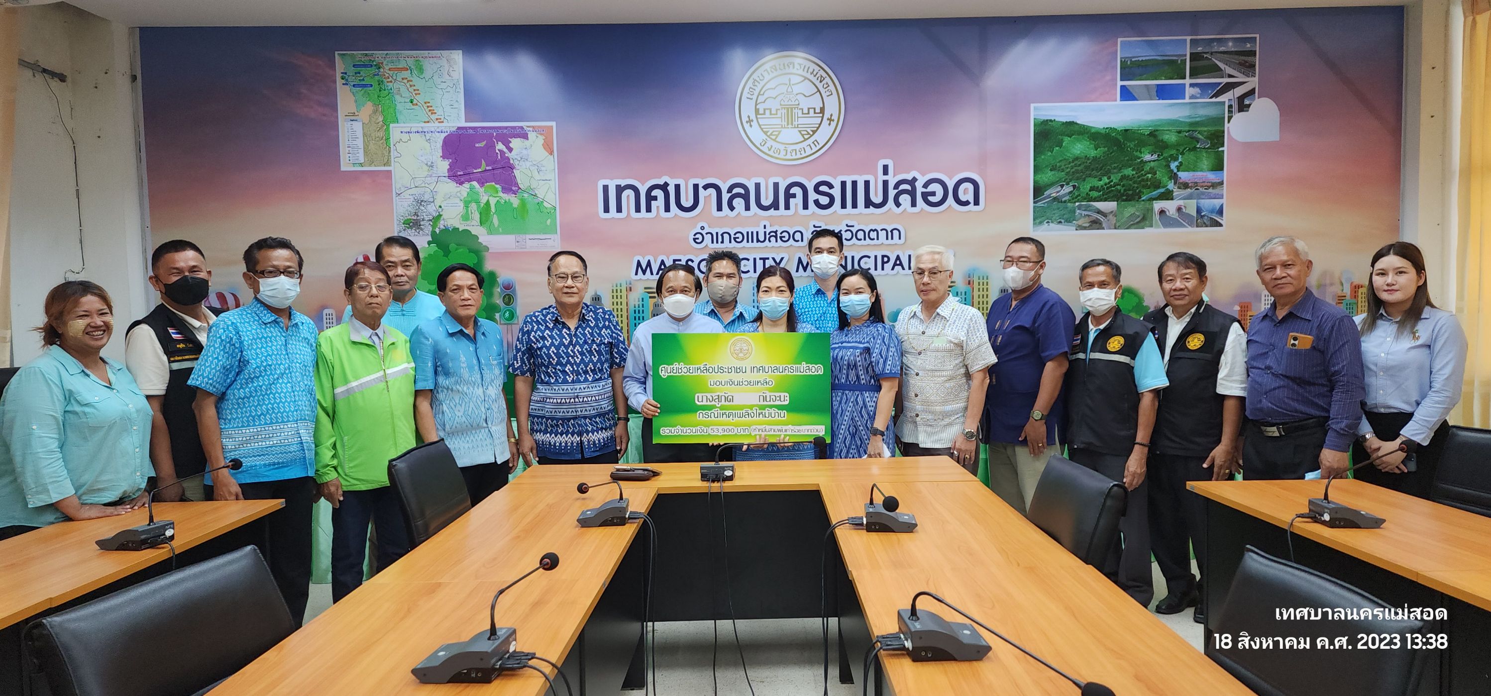 ว่าที่ร้อยตรี ประเสริฐ ปวงละคร นายกเทศมนตรีนครแม่สอด พร้อมคณะผู้บริหาร สมาชิกสภาเทศบาล รองปลัดเทศบาล หัวหน้าสำนักปลัด ข้าราชการและเจ้าหน้าที่ที่เกี่ยวข้องเทศบาลนครแม่สอด เข้าร่วมเป็นเกียรติพิธีมอบเงินช่วยเหลือนางสุภัค กันจะนะ กรณีเหตุเพลิงไหม้บ้าน โดยศูนย์ช่วยเหลือประชาชน เทศบาลนครแม่สอด รวมจำนวนเงิน 53,900 บาท