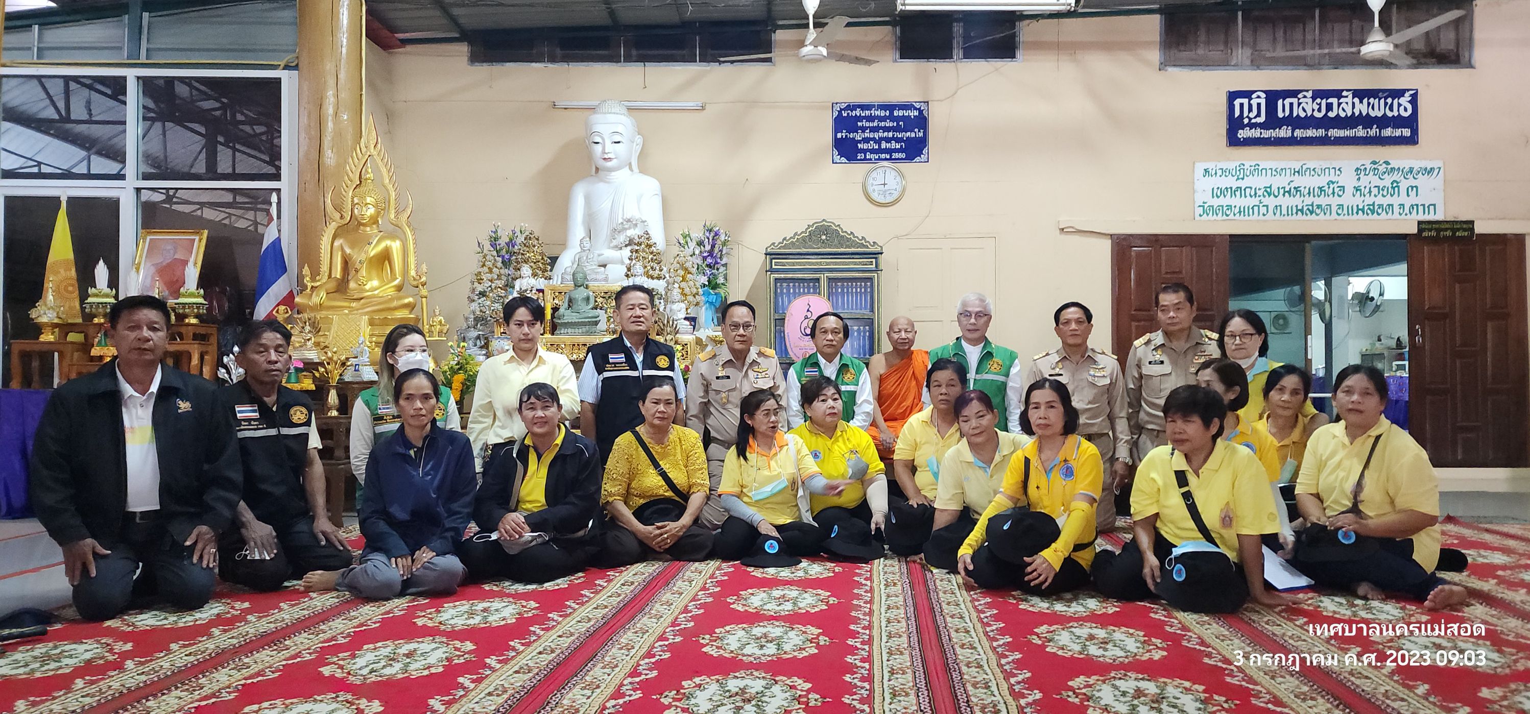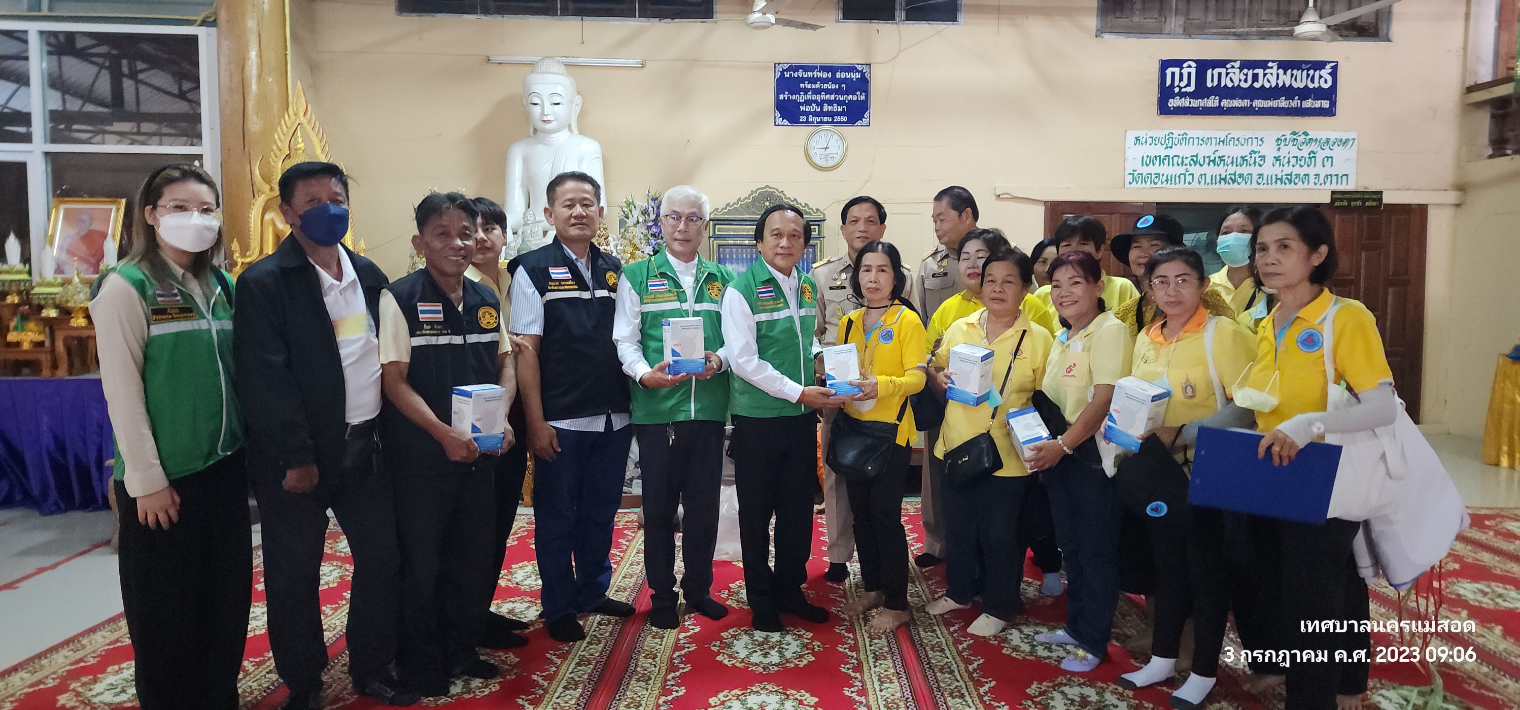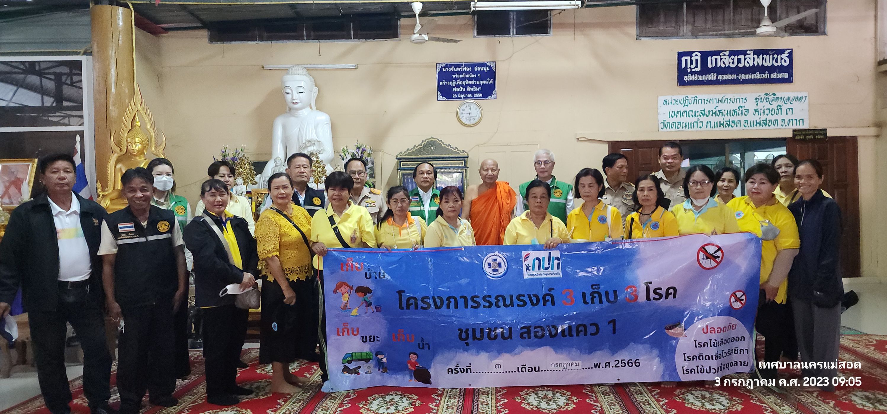 ว่าที่ร้อยตรีประเสริฐ ปวงละคร นายกเทศมนตรีนครแม่สอด พร้อมด้วยคณะผู้บริหาร สมาชิกสภาเทศบาลและเจ้าหน้าที่คลินิกชุมชนอบอุ่นเทศบาลนครแม่สอด ร่วมกับ อาสาสมัครสาธารณสุขชุมชนสองแควและชุมชนร่วมแรง จัดกิจกรรมโครงการรณรงค์ 3 เก็บ 3 โรค บริเวณศาสนสถานวัดดอนแก้ว ครั้งที่ 1