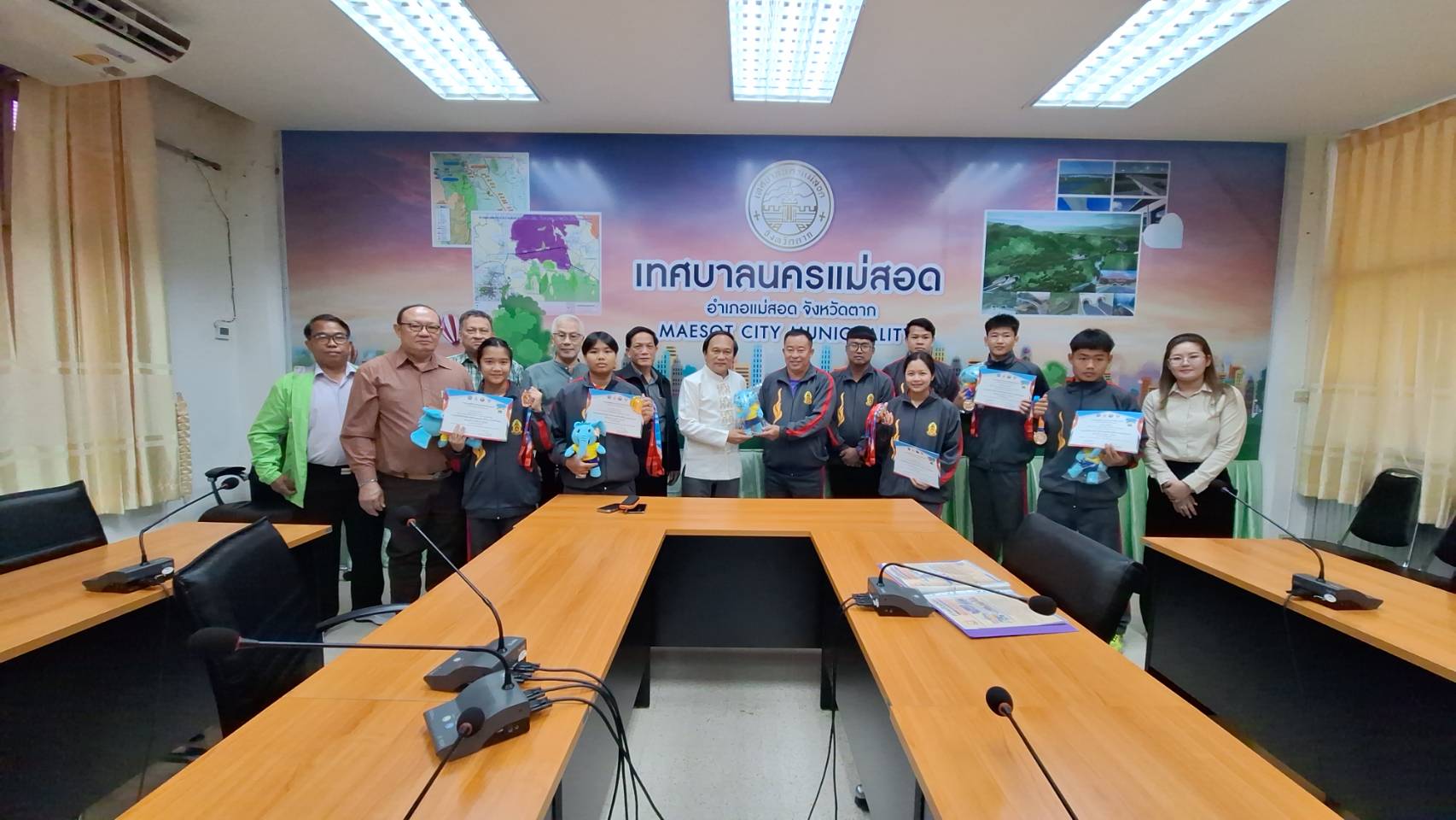 ว่าที่ร้อยตรี ประเสริฐ ปวงละคร นายกเทศมนตรีนครแม่สอด นายกรณพงศ์ คงปาน นายกรกฤตย์ กรัณยพัฒนพงศ์ รองนายกเทศมนตรีนครแม่สอด นายประเสริฐ หอวิจิตร เลขานุการนายกเทศมนตรี นายปรีชา เพชรปัญญา และนายสมเกียรติ สุริยา ที่ปรึกษานายกเทศมนตรี ร่วมแสดงความยินดีและมอบโอวาสแก่นักเรียนที่ได้เป็นตัวแทนเข้าร่วมการแข่งขัน กีฬานักเรียน นักศึกษาแห่งชาติ ครั้งที่ 43 “กระบี่เกมส์” ณ จังหวัดกระบี่ เมื่อวันที่ 23 - 27 มกราคม 2567 นำโดย นายนพพร เที่ยงใจดี รก.ผู้อำนวยการสถานศึกษาโรงเรียนกีฬาเทศบาลนครแม่สอดและครูผู้ฝึกสอนกีฬา คว้าเหรียญรางวัลกลับมาได้รวมทั้งสิ้น 3 เหรียญทอง 7 เหรียญทองแดง ได้แก่