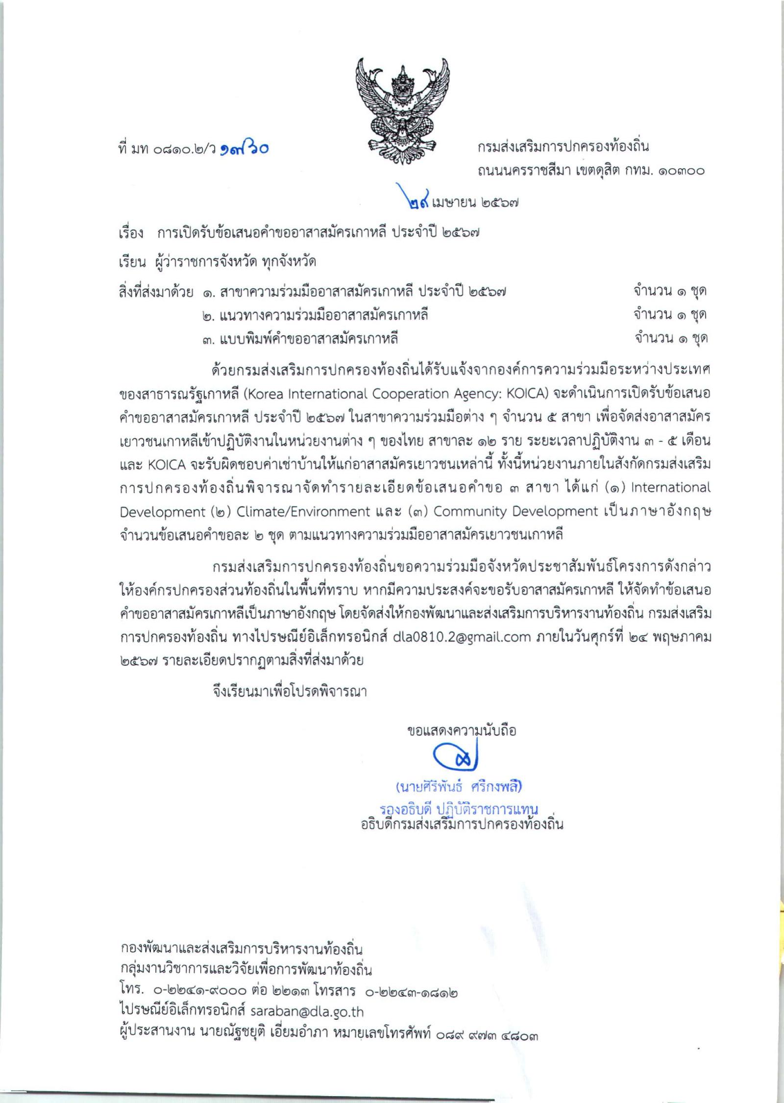 ตามที่กรมส่งเสริมการปกครองส่วนท้องถิ่นได้ขอความร่วมมือจังหวัดประชาสัมพันธ์การเปิดรับสมัคร ข้อเสนอคำขออาสาสมัครเกาหลี ประจำปี ๒๕๖๗ เทศบาลนครแม่สอดจึงขอประชาสัมพันธ์ให้องค์กรปกครองส่วนท้องถิ่น ที่มีความประสงค์จะขอรับอาสาสมัครเกาหลี ให้จัดทำข้อเสนอคำขออาสาสมัครเกาหลีเป็นภาษาอังกฤษ โดยจัดส่งให้กองพัฒนาและส่งเสริมการบริหารงานท้องถิ่น กรมส่งเสริมการบริหารงานท้องถิ่น กรมส่งเสริมการปกครองท้องถิ่น รายละเอียดเพิ่มเติมตามเอกสารด้านล่างนี้