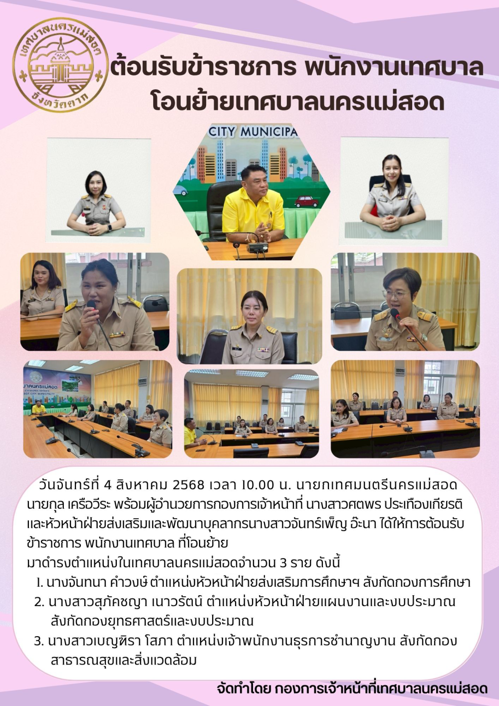 ต้อนรับ ข้าราชการ พนักงานเทศบาล ที่โอนย้าย มาดำรงตำแหน่งในเทศบาลนครแม่สอด จำนวน 3 ราย