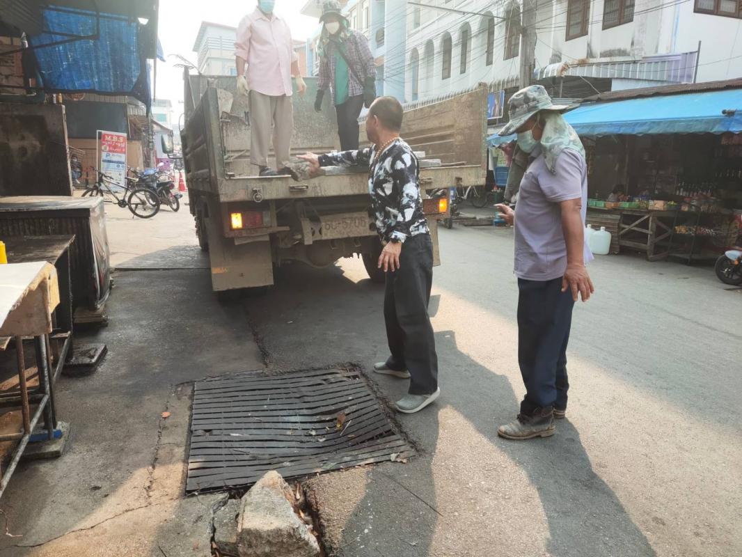 ออกดำเนินการทะลวงท่อระบายน้ำอุดตัน บริเวณหน้าร้านนำชัยสปอร์ต (ร้านขายชุดกีฬา) บริเวณตลาดบ้านเหนือ