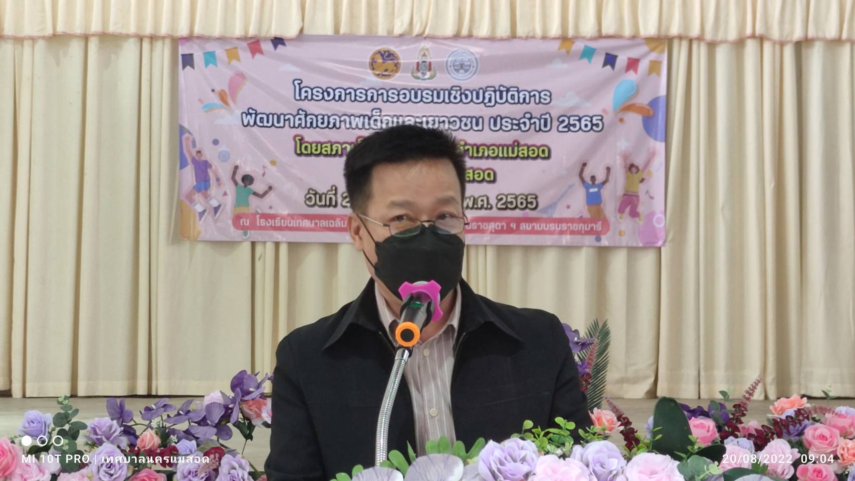 ว่าที่ร้อยตรีประเสริฐ ปวงละคร นายกเทศมนตรีนครแม่สอด มอบหมายให้ นายกรณพงษ์ คงปาน รองนายกเทศมนตรีเข้าร่วมเป็นเกียรติ พร้อมกล่าวต้อนรับผู้ที่มาเข้าร่วมโครงการ “อบรมเชิงปฏิบัติการพัฒนาศักยภาพเด็กและเยาวชน ประจำปี 2565” โดยมี นายธีระนันท์ ไชยมานันท์ ปลัดอำเภอแม่สอดเป็นประธานเปิดการอบรม และมีประธานสภาเด็กและเยาวชน อำเภอแม่สอด เป็นผู้กล่าวรายงาน