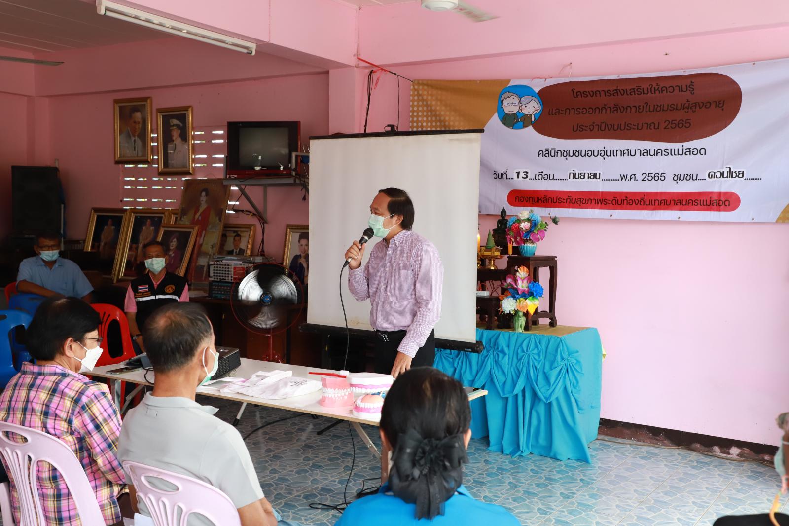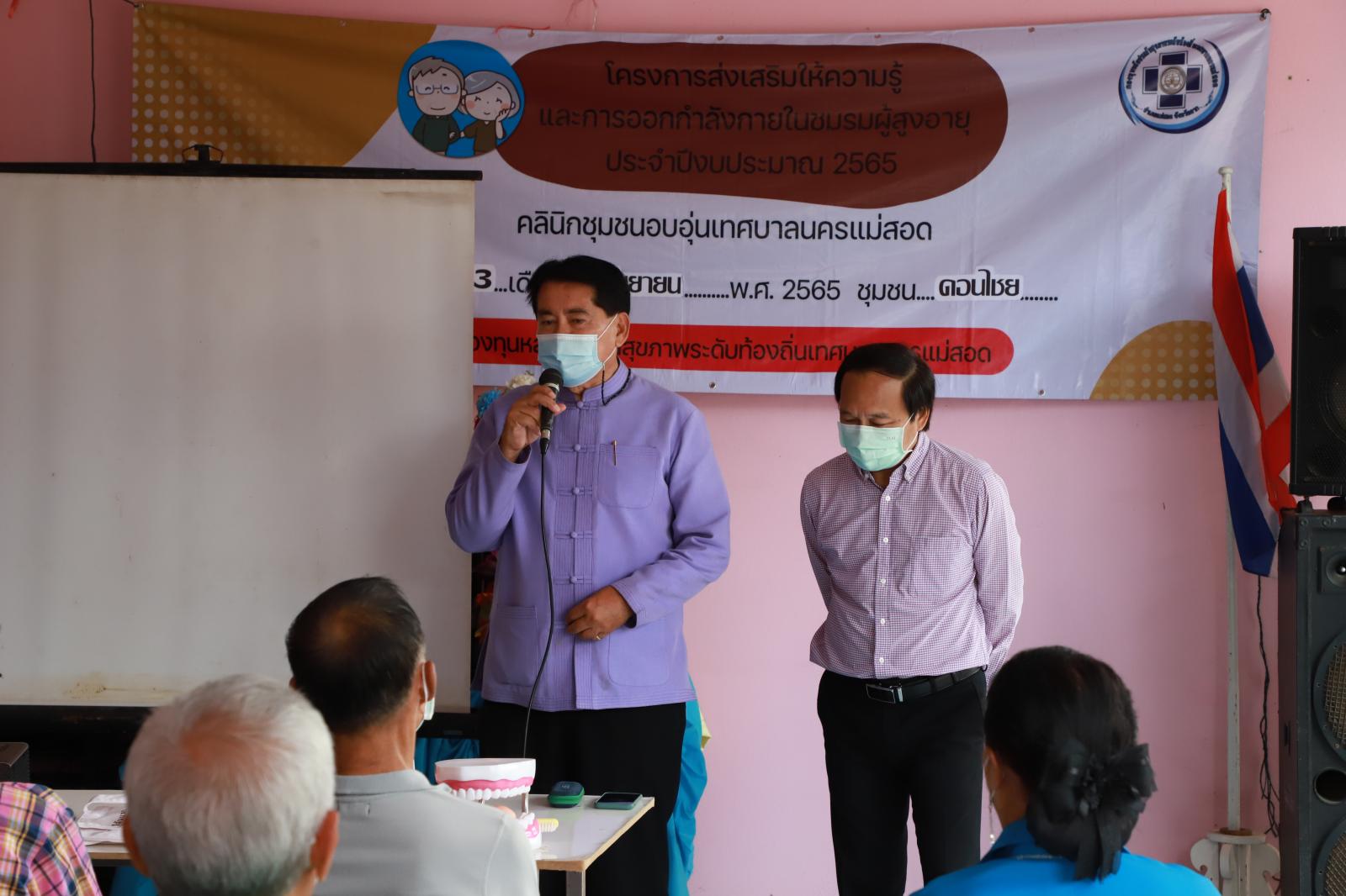 ว่าที่ร้อยตรีประเสริฐ ปวงละคร นายกเทศมนตรีนครแม่สอด พร้อมด้วย คณะผู้บริหาร ประธานสภาเทศบาล และสมาชิกสภาเทศบาล ร่วมกิจกรรมโครงการส่งเสริมความรู้และการออกกำลังกายในชมรมผู้สูงอายุชุมชนดอนไชย นำผู้สูงอายุเข้าร่วมกิจกรรม โดยกิจกรรมประกอบไปด้วย การตรวจคัดกรองสุขภาพ (ชั่งน้ำหนัก วัดส่วนสูง วัดรอบเอว วัดความดันโลหิต) กิจกรรมทดสอบความรู้ ก่อนเข้ารับการอบรม กิจกรรมให้ความรู้และการฝึกปฏิบัติเรื่อง “การออกกำลังกายสำหรับผู้สูงอายุ” กิจกรรมนันทนาการให้ความรู้เรื่อง “สุขภาพช่องปากสำหรับผู้สูงอายุ” เพื่อให้ผู้สูงอายุสามารถนำความรู้ไปใช้ในการดำเนินชีวิตประจำวันได้