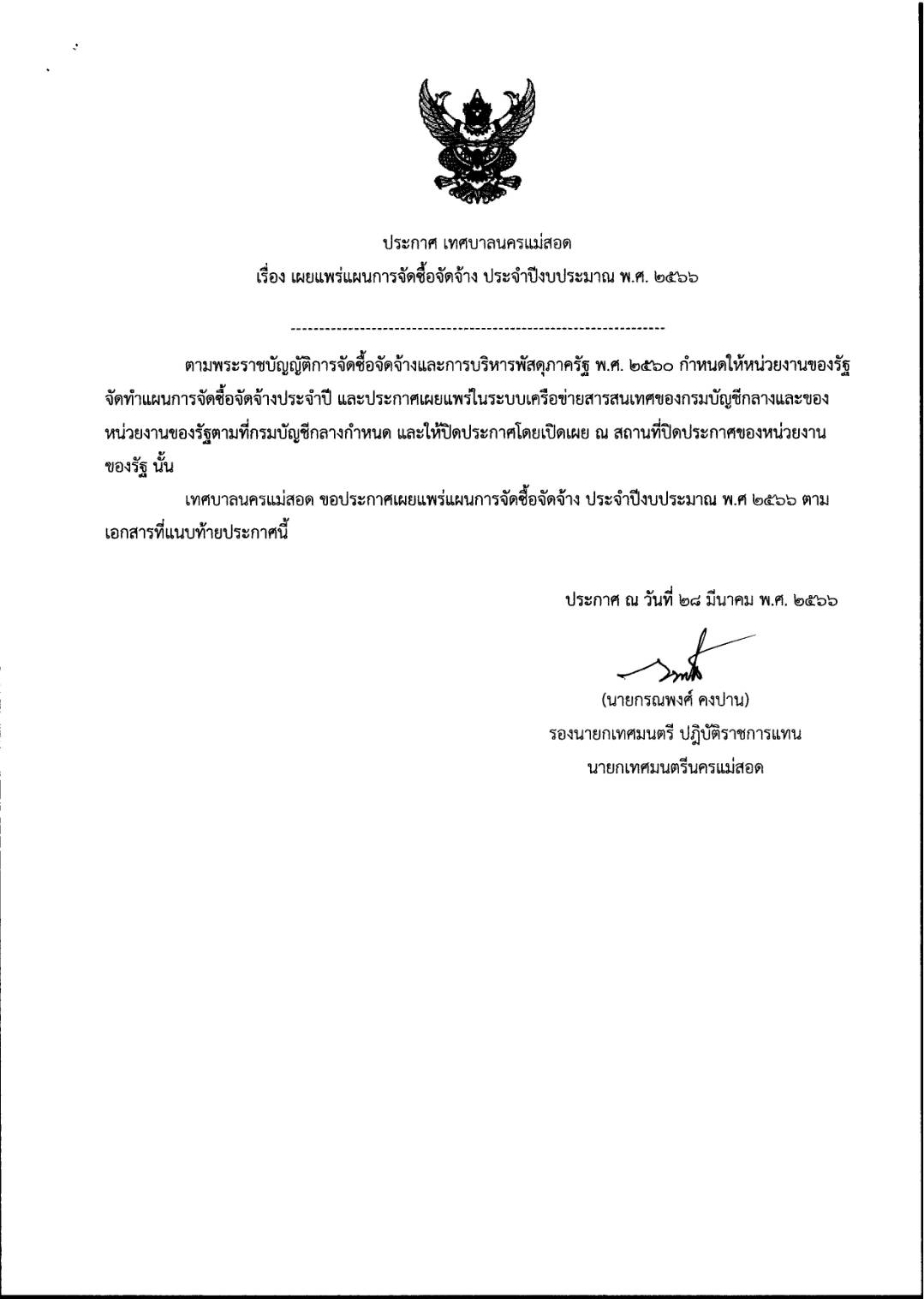 ประกาศเทศบาลนครแม่สอด เรื่อง เผยแพร่แผนการจัดซื้อจัดจ้าง ประจำปีงบประมาณ พ.ศ.2566