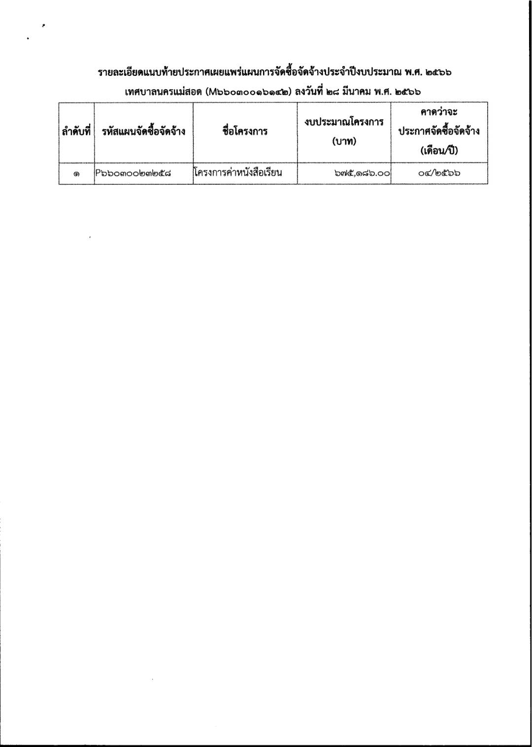 ประกาศเทศบาลนครแม่สอด เรื่อง เผยแพร่แผนการจัดซื้อจัดจ้าง ประจำปีงบประมาณ พ.ศ.2566 (ค่าหนังสือเรียน ลงวันที่ 28 มี.ค. 2566)
