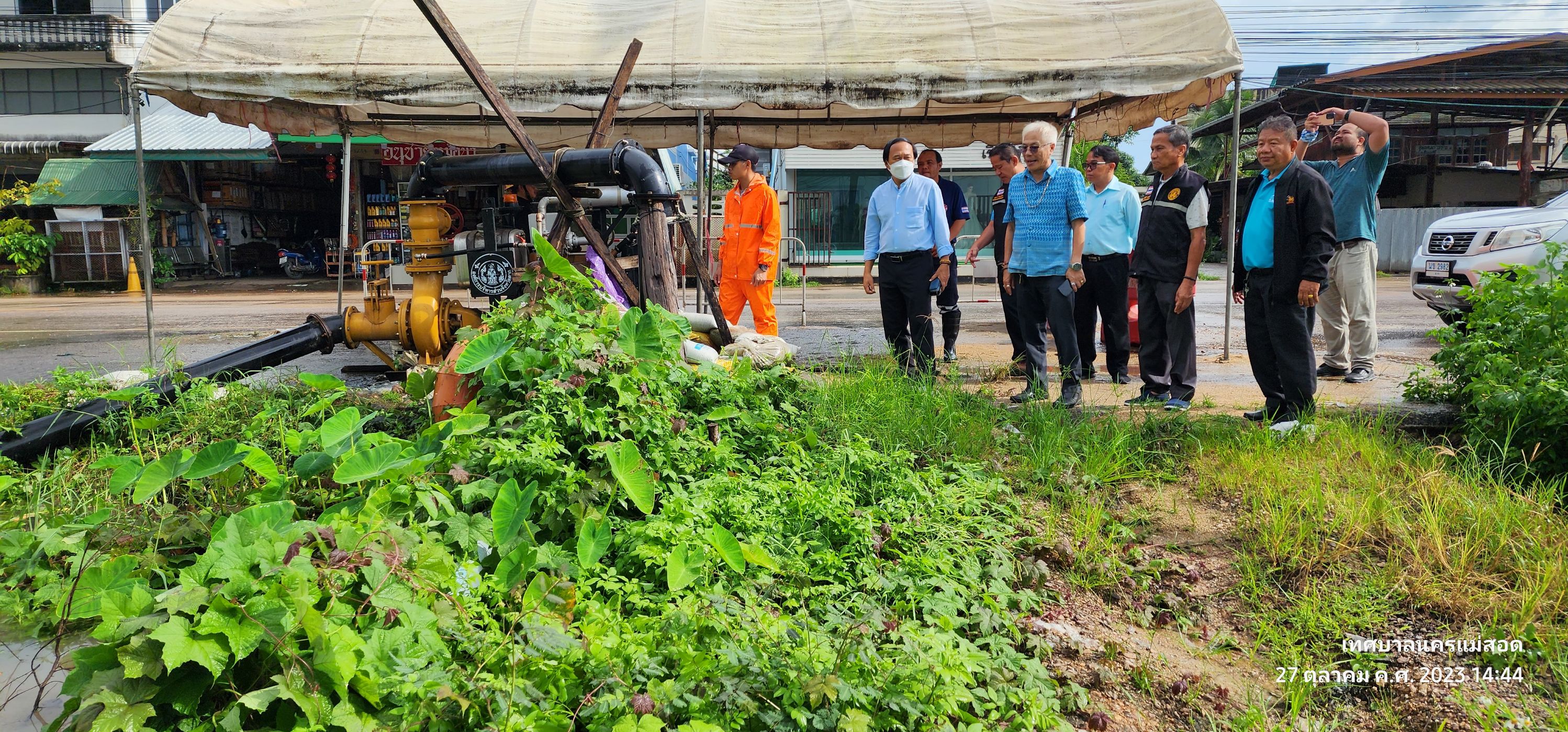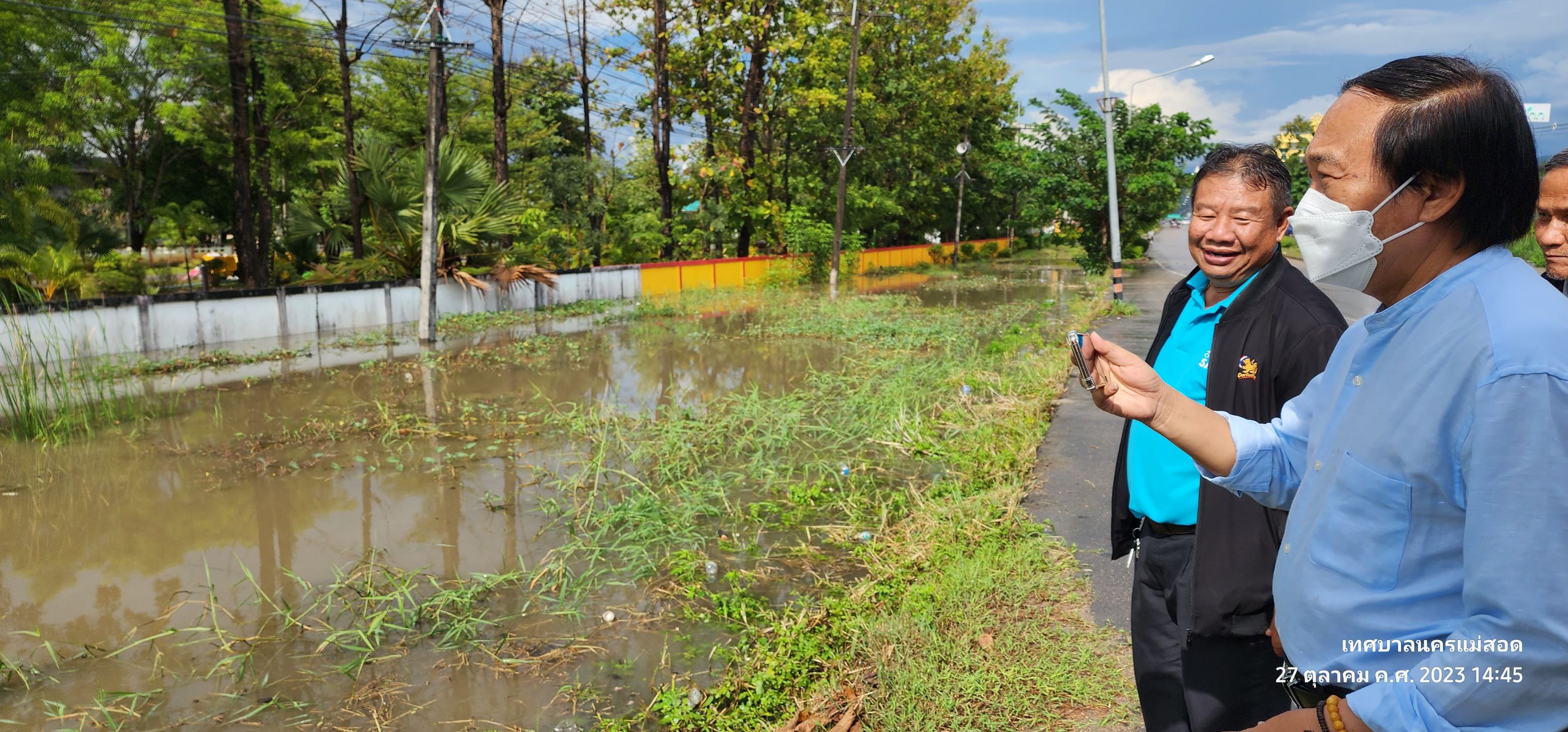 ว่าที่ร้อยตรี ประเสริฐ ปวงละคร นายกเทศมนตรีนครแม่สอด พร้อมด้วยคณะผู้บริหาร สมาชิกสภาเทศบาลนครแม่สอด และเจ้าหน้าที่ป้องกันและบรรเทาสาธารณภัย ลงพื้นที่สำรวจและติดตามปริมาณน้ำ บริเวณหน้าแขวงทางหลวงตาก ที่ 2 (แม่สอด) หลังจากได้มอบหมายให้เจ้าหน้าที่ป้องกันฯ จัดชุดปฏิบัติการออกเติมน้ำมันเชื้อเพลิงและติดเครื่องสูบน้ำอย่างต่อเนื่อง