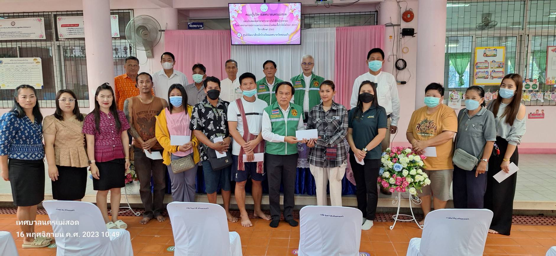 ว่าที่ร้อยตรี ประเสริฐ ปวงละคร นายกเทศมนตรีนครแม่สอด พร้อมด้วยคณะผู้บริหาร สมาชิกสภาเทศบาล หัวหน้าฝ่ายและเจ้าหน้าที่กองการศึกษา มอบเงินชดเชยค่าอาหารกลางวันให้ผู้ปกครองในช่วงสถานการณ์การแพร่ระบาดของโรคติดเชื้อไวรัสโคโรนา 2019 (COVID - 19) ปีการศึกษา 2563 ณ ศูนย์พัฒนาเด็กเล็กในสังกัดเทศบาลนครแม่สอด ประกอบด้วย 1.ศูนย์พัฒนาเด็กเล็กโรงเรียนเทศบาลวัดมณีไพรสณฑ์ 2.ศูนย์พัฒนาเด็กเล็กวัดอรัญญเขต 3.ศูนย์พัฒนาเด็กเล็กโรงเรียนเทศบาลวัดดอนแก้ว 4.ศูนย์พัฒนาเด็กเล็กวัดดอนแก้ว