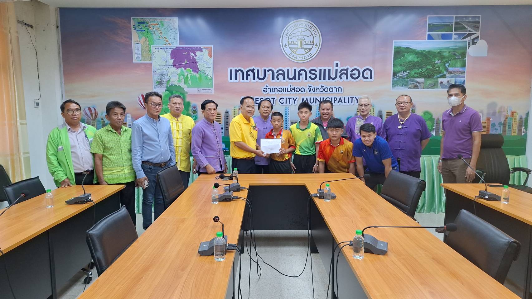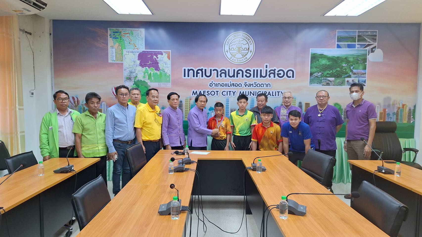 ว่าที่ร้อยตรี ประเสริฐ ปวงละคร นายกเทศมนตรีนครแม่สอด พร้อมด้วย คณะผู้บริหาร สมาชิกสภาเทศบาล และคณะครูจากโรงเรียนกีฬาเทศบาลนครแม่สอด นำโดย นายนพพร ใจเที่ยง รักษาการผู้อำนวยการโรงเรียนกีฬาเทศบาลนครแม่สอด ร่วมแสดงความยินดีและกล่าวให้โอวาทกับ ด.ช.ธีรภัทร ธรรมโหร ชั้น ม.1 นักเรียนที่ได้รับรางวัล เหรียญทอง การแข่งขันมวยสากลยุวชน เยาวชนชิงชนะเลิศแห่งประเทศไทย 2567 รุ่นลิตเติลเวท น้ำหนักไม่เกิน 40 กิโลกรัม ยุวชน ชาย ข. ซึ่งเป็นการเข้าร่วมแข่งขันครั้งแรก ณ ศูนย์ฝึกกีฬาแห่งชาติมวกเหล็ก อำเภอมวกเหล็ก จังหวัดสระบุรี เมื่อวันที่ 27 เมษายน 2567 ที่ผ่านมา