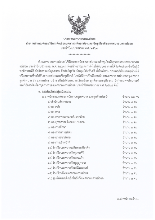 ประกาศเทศบาลนครแม่สอด เรื่อง หลักเกณฑ์และวิธีการคัดเลือกบุคลากรเพื่อยกย่องและเชิดชูเกียรติของเทศบาลนครแม่สอด ประจำปีงบประมาณ พ.ศ. 2568