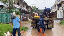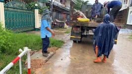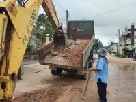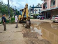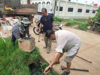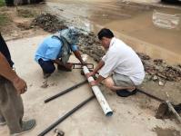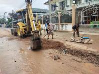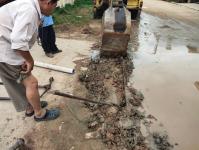 ดำเนินการขุดวางท่อระบายน้ำ pvc เพื่อระบายน้ำท่วมขังบนผิวถนน