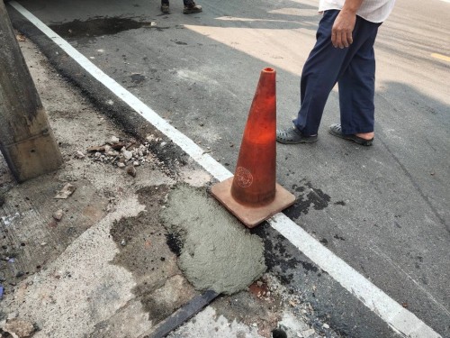 1. เจ้าหน้าที่ภาคสนามกองช่างสุขาภิบาล เข้าดำเนินการเทปูนอุดโพรง ขอบฝาท่อระบายน้ำ (รางยู)