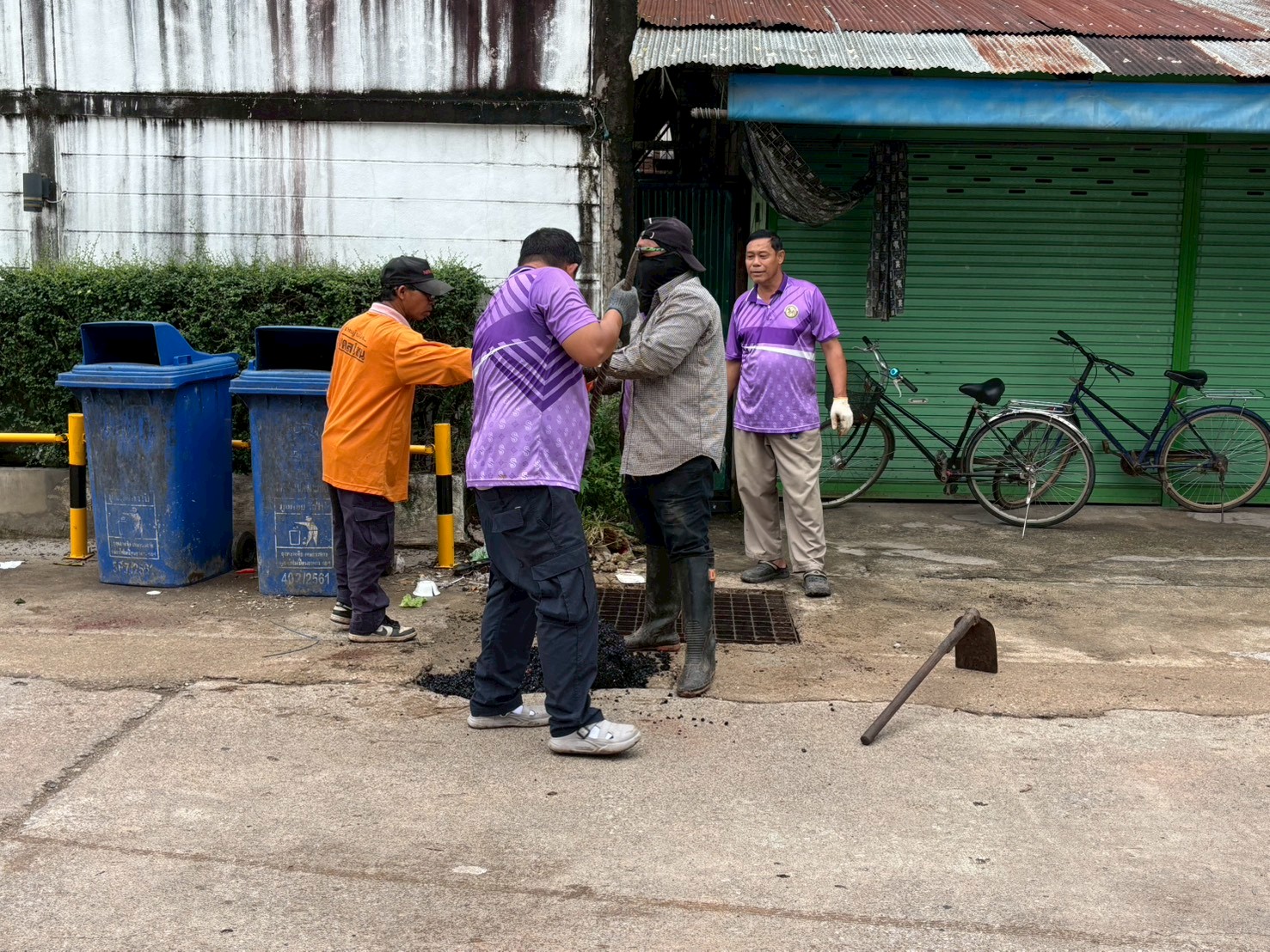 3. ได้เข้าดำเนินการลงยางมะตอยผิวจราจรที่ชำรุด บริเวณถนนเย็นอากาศ จำนวน 2 จุด