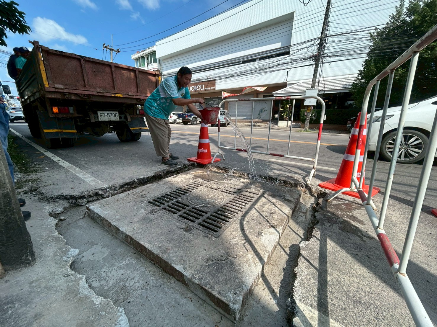 2. ได้เข้าดำเนินการนำน้ำบ่มซีเมนต์ งานซ่อมแซมฝาท่อระบายน้ำ บริเวณสี่แยกเจ้าสัว