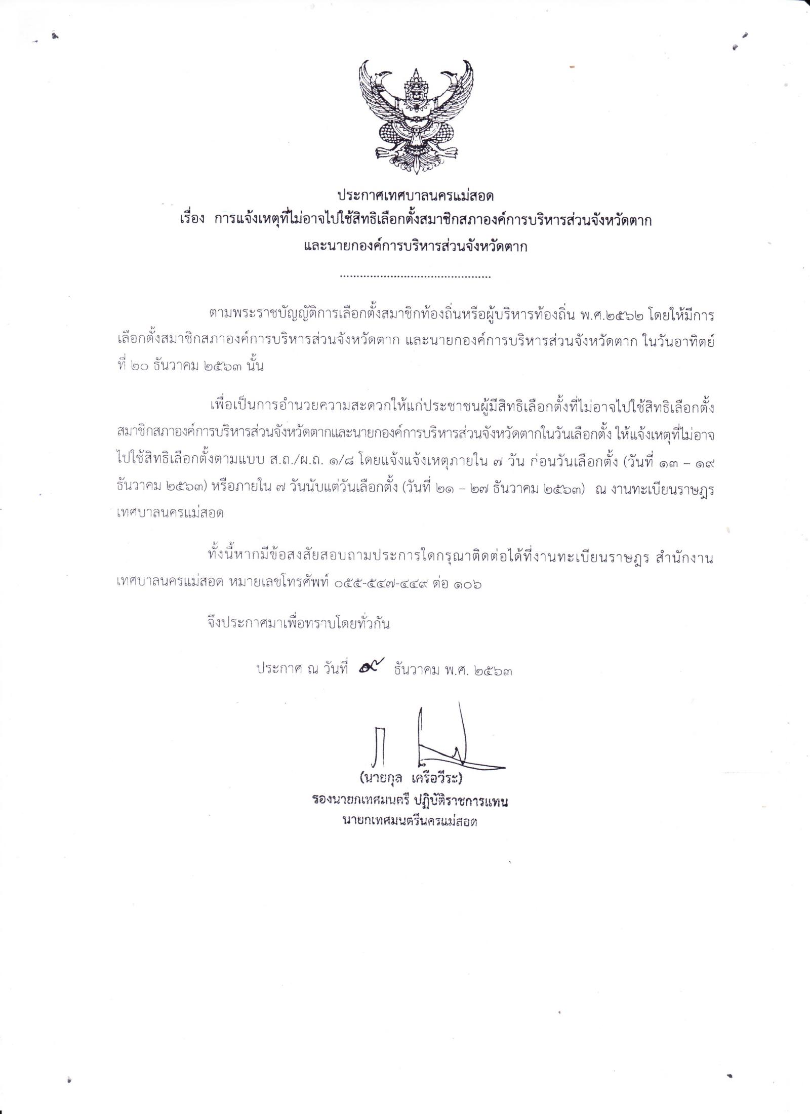 ประกาศเทศบาลนครแม่สอด เรื่อง การแจ้งเหตุที่ไม่อาจไปใช้สิทธิเลือกตั้งสมาชิกสภาองค์การบริหารส่วนจังหวัดตากและนายกองค์การบริหารส่วนจังหวัดตาก