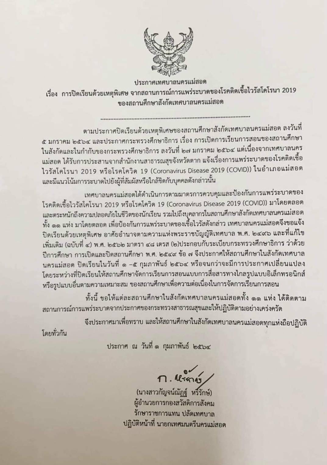 ประกาศเทศบาลนครแม่สอด เรื่องการปิดเรียนด้วยเหตุพิเศษ จากสถานการณ์การแพร่ระบาดของโรคติดเชื้อไวรัสโคโรนา 2019 ของสถานศึกษาสังกัดเทศบาลนครแม่สอด