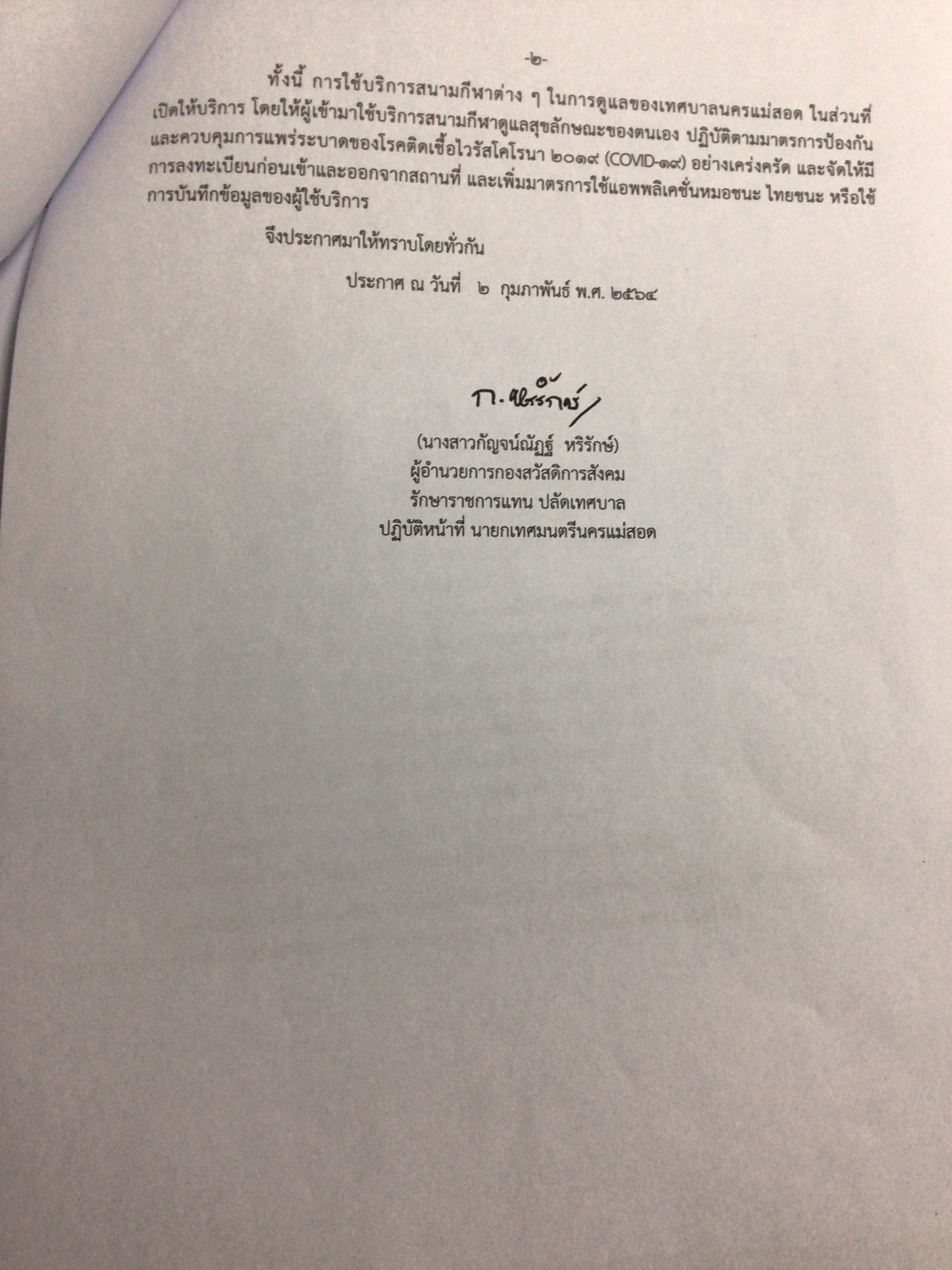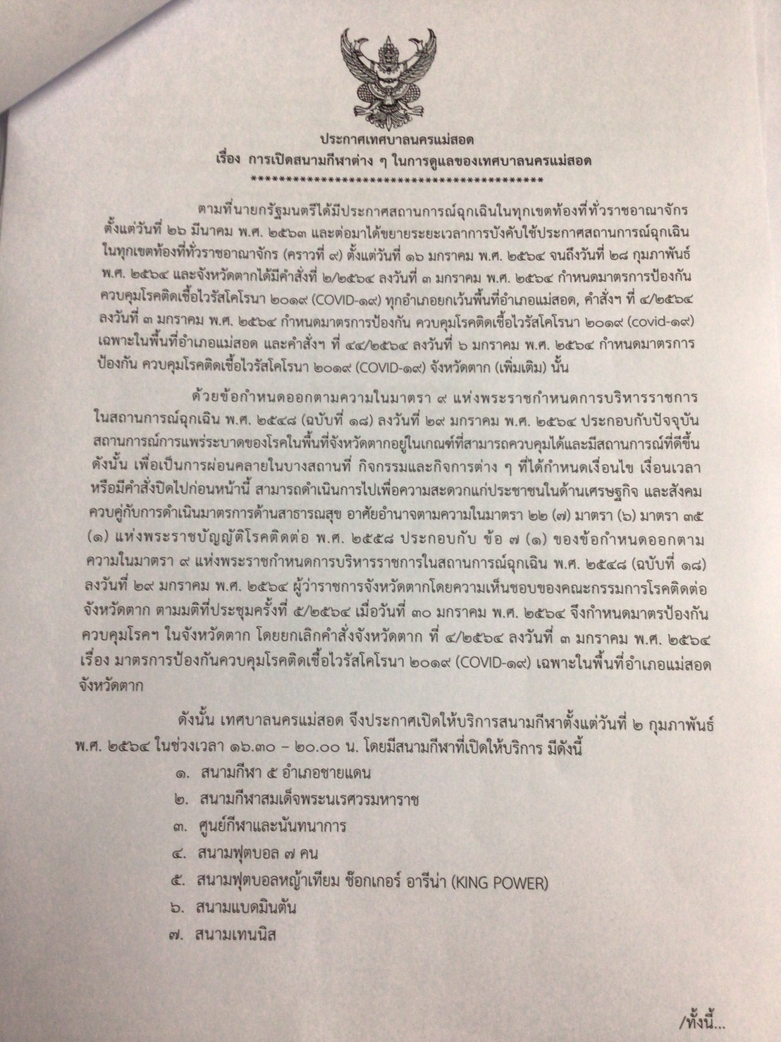 ประกาศเทศบาลนครแม่สอด เรื่อง การเปิดสนามกีฬาต่างๆ ในการดูแลของเทศบาลนครแม่สอด