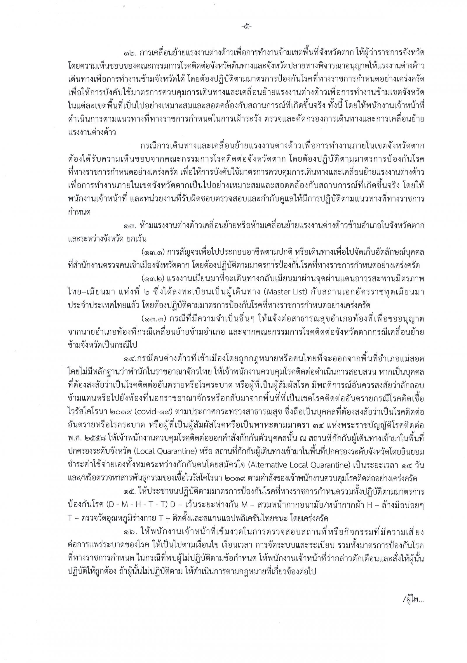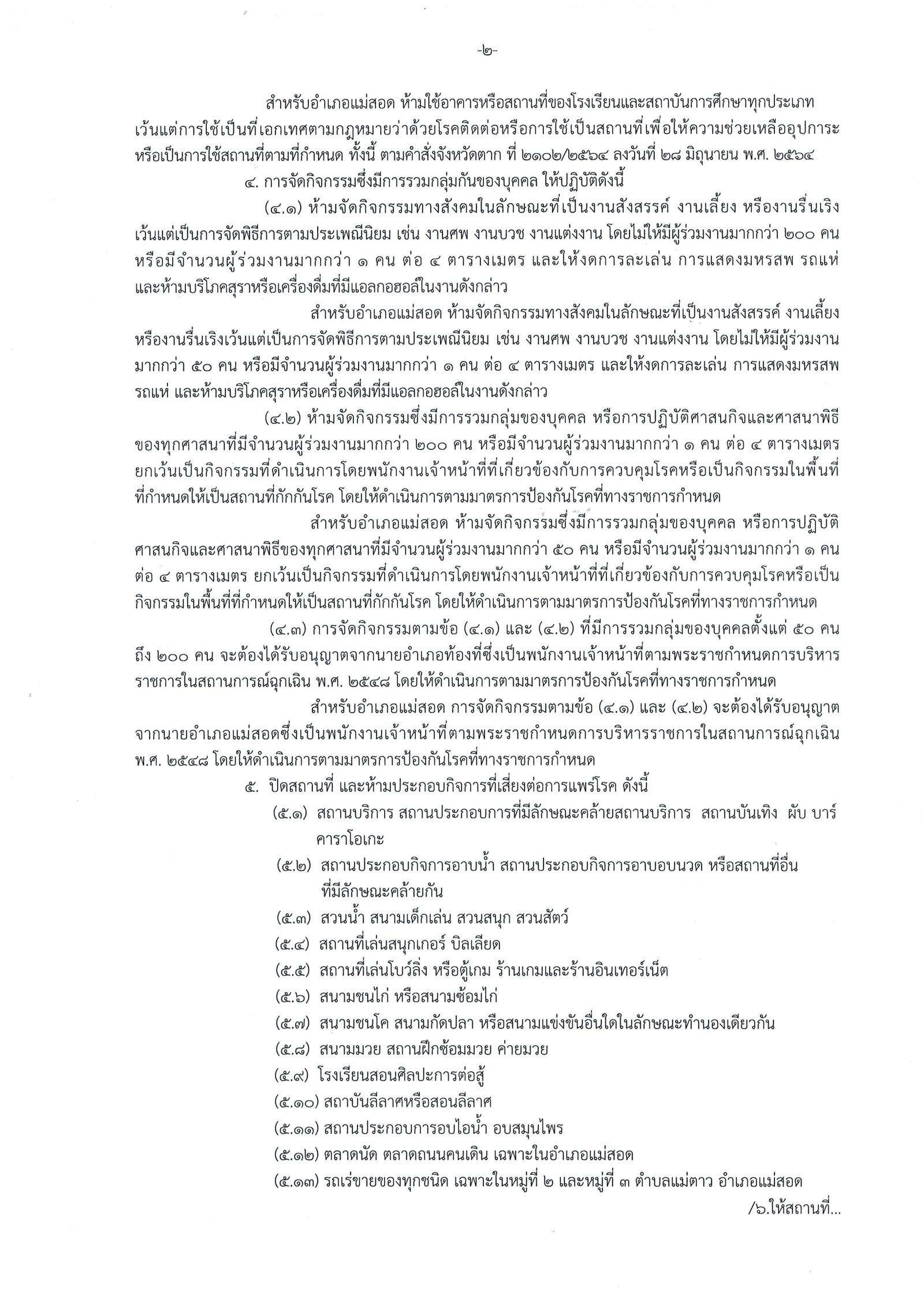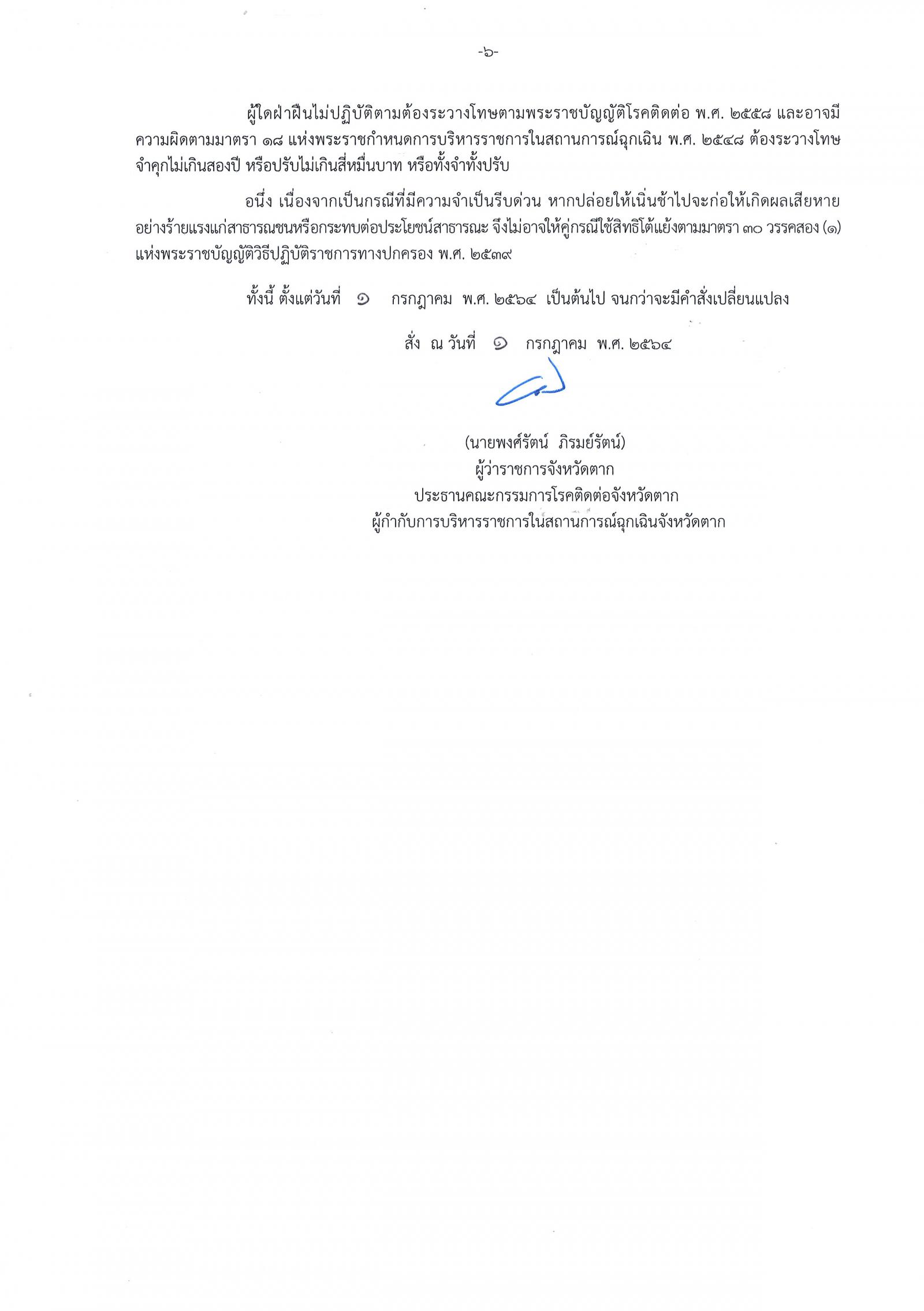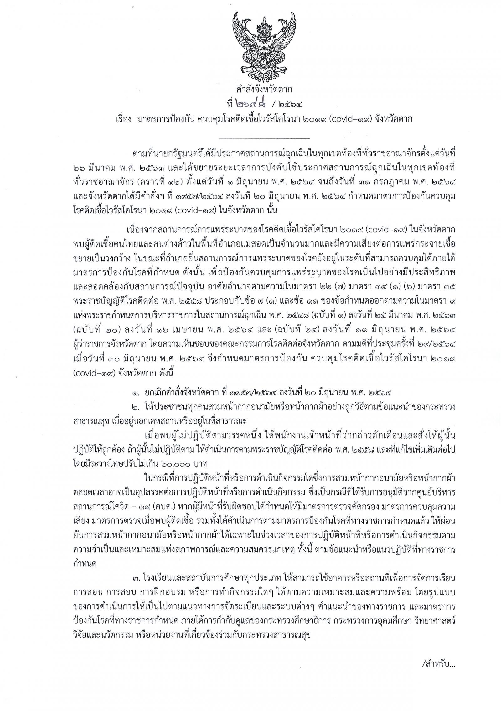 คำสั่งจังหวัดตาก ที่ 2198/2564 เรื่อง มาตรการป้องกัน ควบคุมโรคติดเชื้อไวรัสโคโรนา 2019 (โควิด-19) จังหวัดตาก