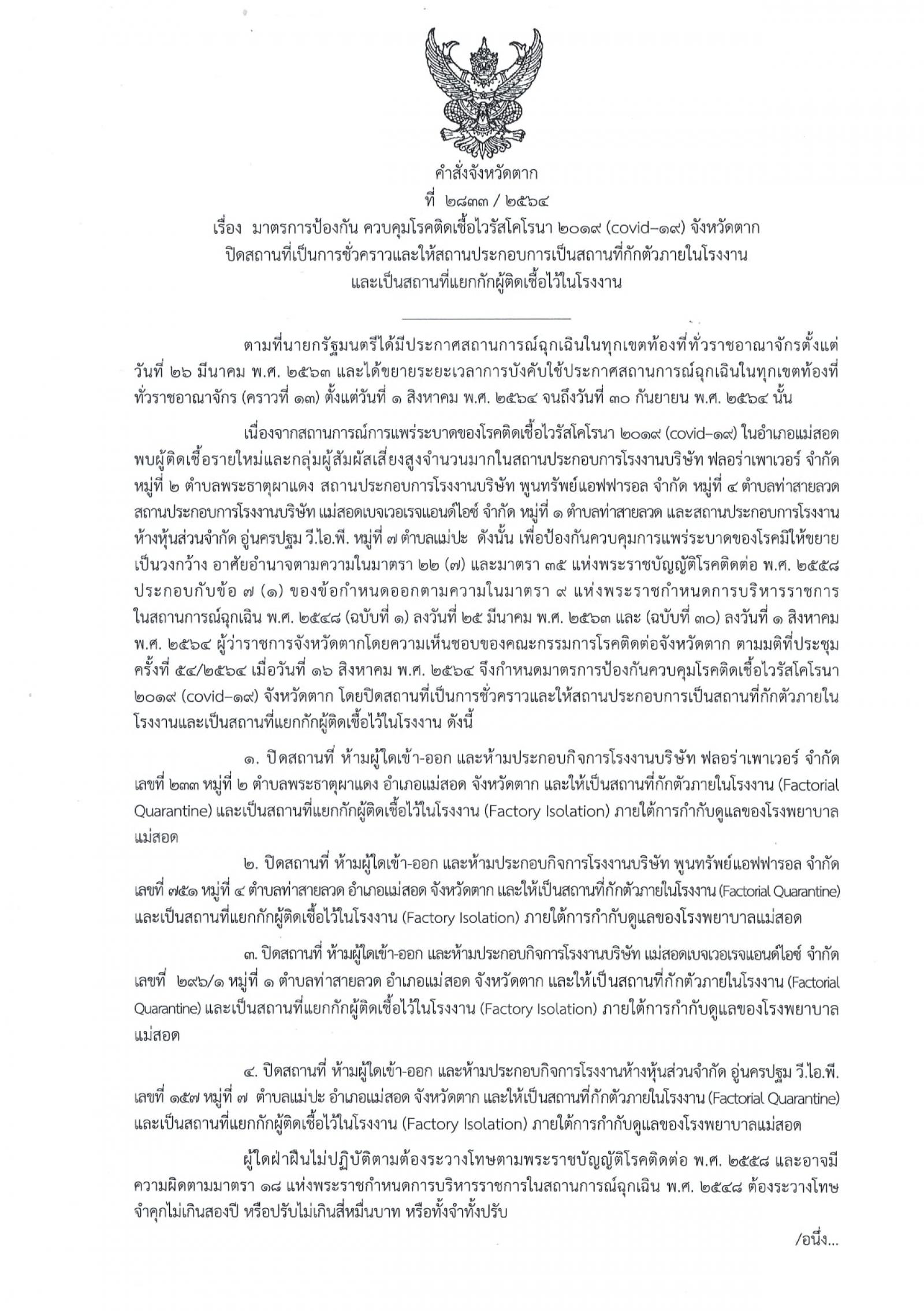 คำสั่งจังหวัดตาก ที่ 2833/2564 เรื่อง มาตรการป้องกัน ควบคุมโรคติดเชื้อไวรัสโคโรนา 2019 (โควิด-19) จังหวัดตาก ปิดสถานที่เป็นการชั่วคราวและให้สถานประกอบการเป็นสถานที่กักตัวภายในโรงงานและเป็นสถานที่แยกกักผู้ติดเชื้อไว้ในโรงงาน