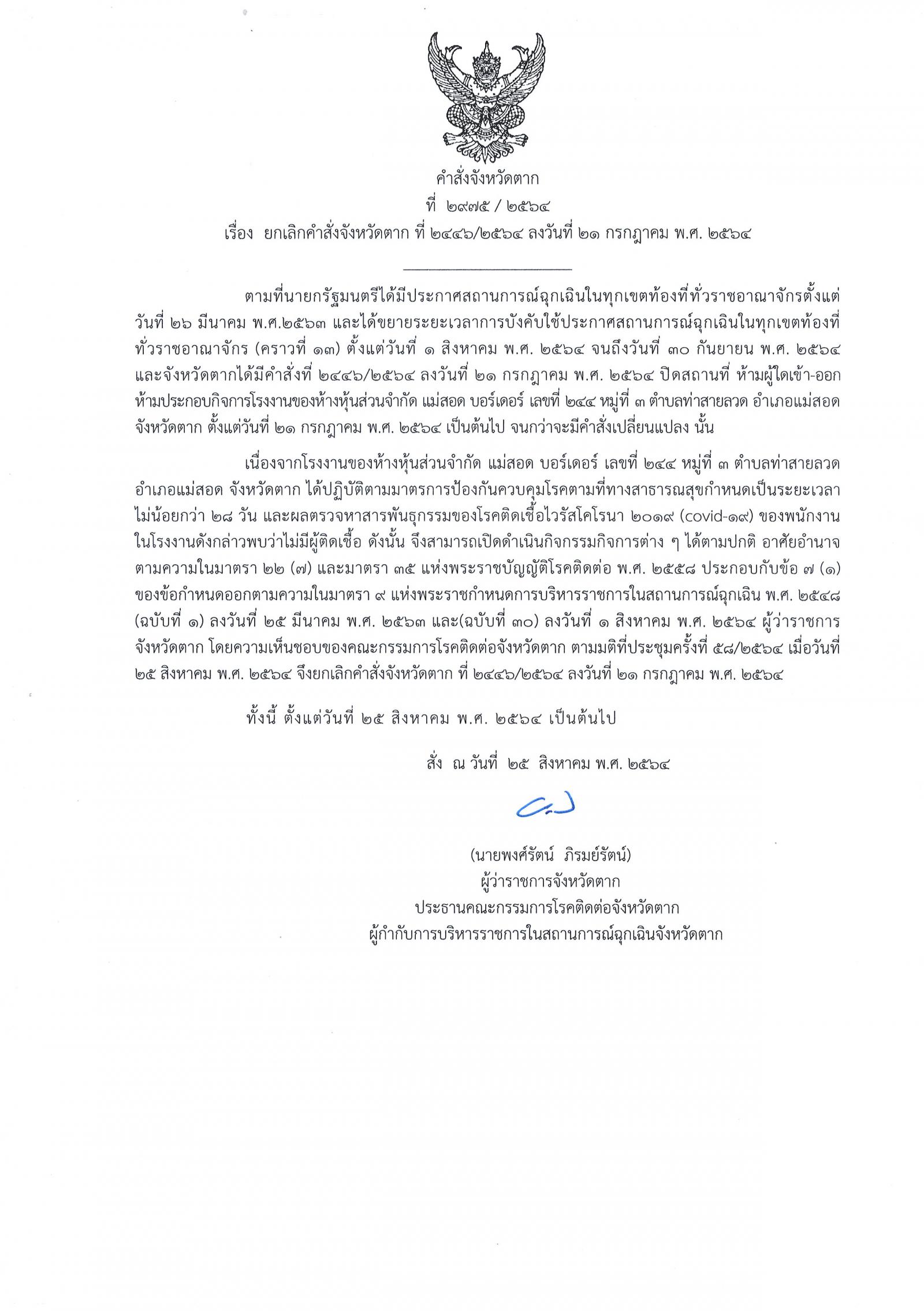 คำสั่งจังหวัดตาก ที่ 2975/2564 เรื่อง ยกเลิกคำสั่งจังหวัดตากที่ 2446/2564 ลงวันที่ 21 กรกฎาคม 2564