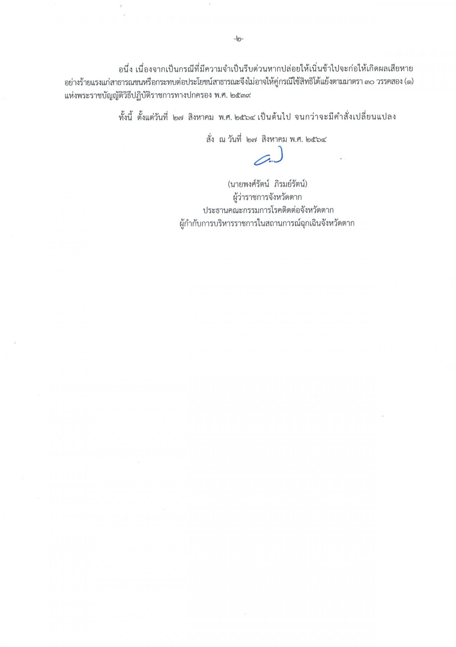 คำสั่งจังหวัดตาก ที่ 3044/2564 เรื่อง มาตรการป้องกัน ควบคุมโรคติดเชื้อไวรัสโคโรนา 2019 (โควิด-19) จังหวัดตาก ปิดพื้นที่เป็นการชั่วคราวและให้เป็นสถานที่กักตัวไว้ที่พักอาศัยและเป็นสถานที่แยกกักผู้ติดเชื้อไว้ที่พักอาศัย
