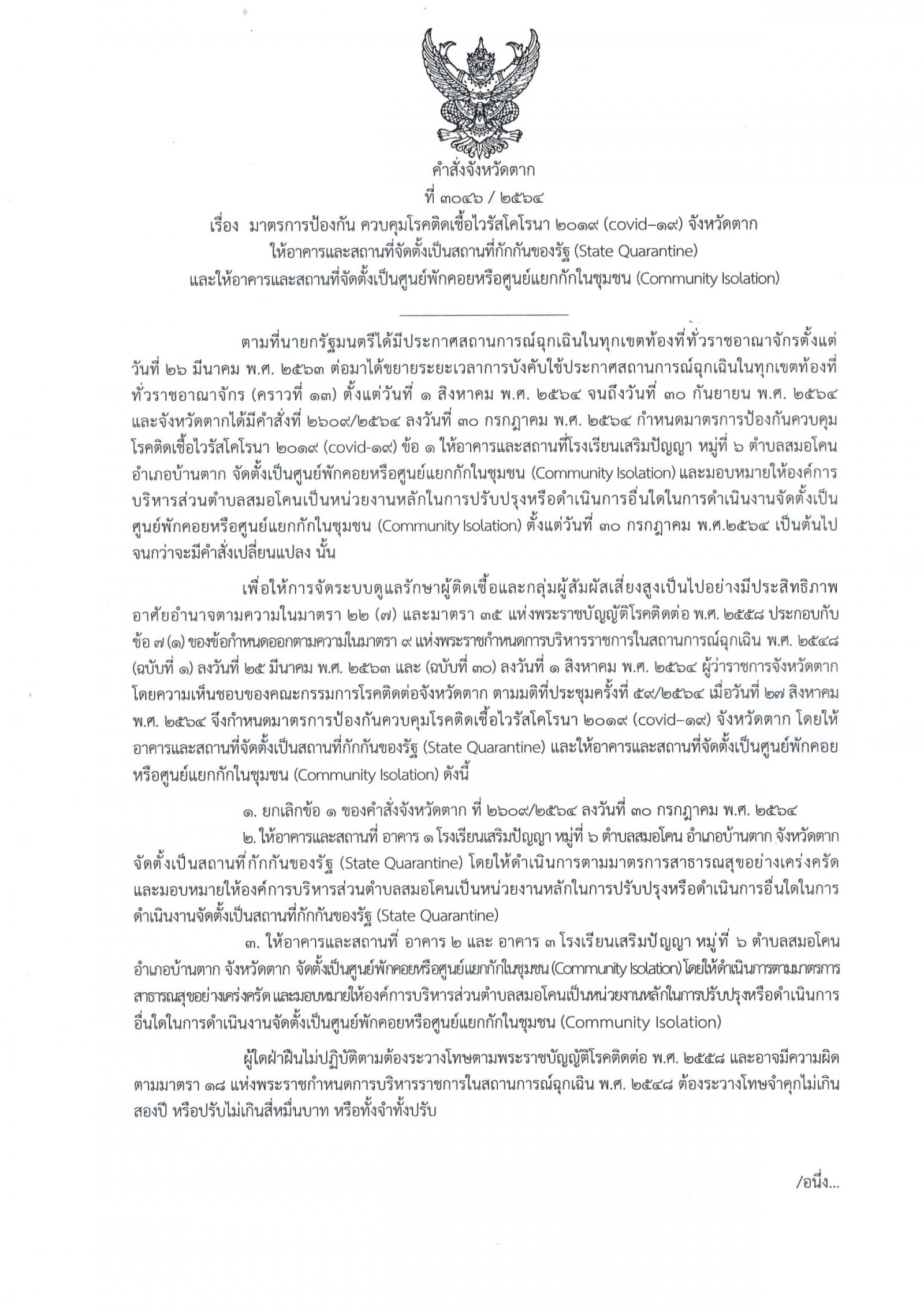 คำสั่งจังหวัดตาก ที่ 3046/2564 เรื่อง มาตรการป้องกัน ควบคุมโรคติดเชื้อไวรัสโคโรนา 2019 (โควิด-19) จังหวัดตาก ให้อาคารและสถานที่จัดตั้งเป็นสถานที่กักกันของรัฐ (State Quarantine) และให้อาคารและสถานที่จัดตั้งเป็นศูนย์พักคอยหรือศูนย์แยกกักในชุมชน (Community Isolation)